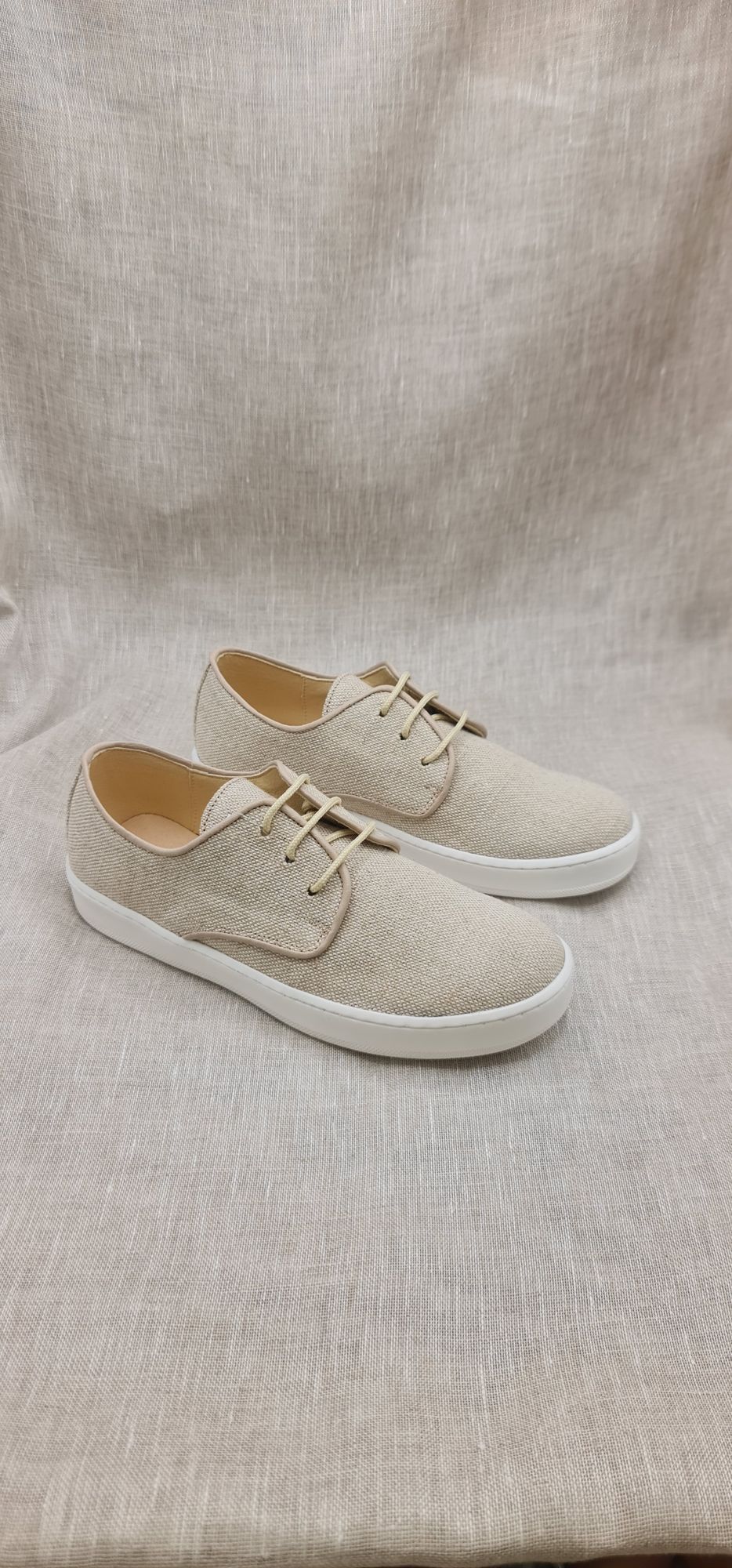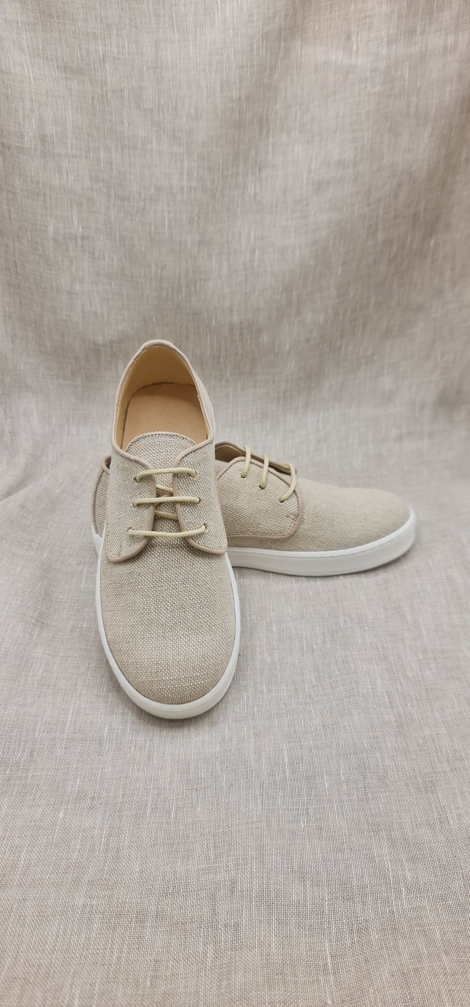 Zapato de piel  con lino en color beige y suela de goma. Ideal trajes tipo lino o de calle con estilo moderno. Hechos en España.