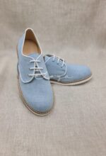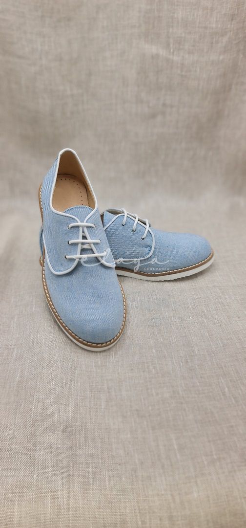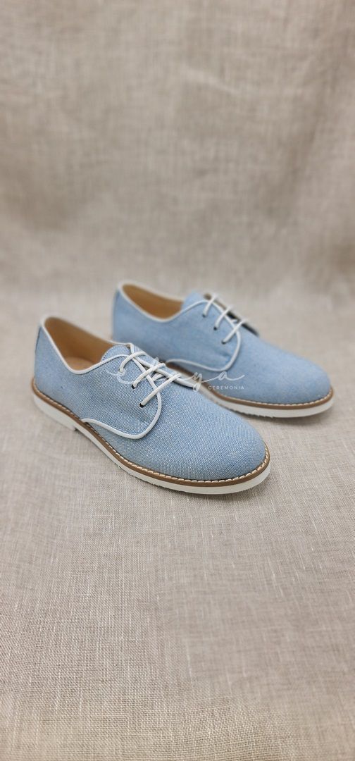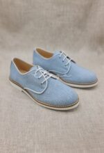 Zapato de piel con lino en color celeste . Ideal trajes tipo lino o de calle con estilo moderno. Hechos en España.