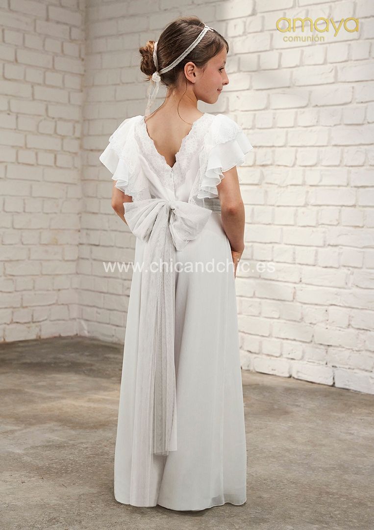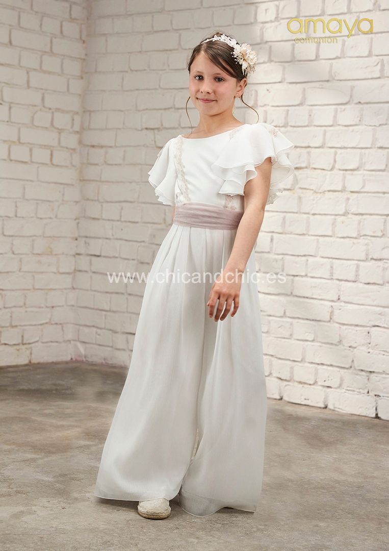 Mono de ceremonia en crep liso. El cuerpo lleva una manga volante, y está decorado por una puntilla en tono malva suave, al igual que el fajín.