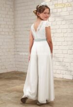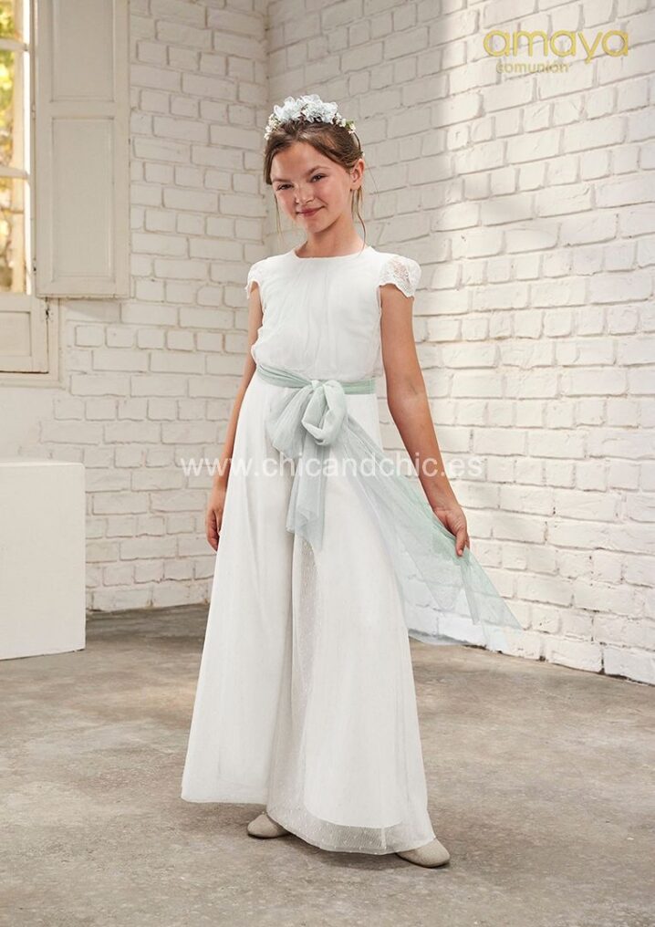 Mono de ceremonia en tul. El cuerpo es manga corta, de tul todo en blanco roto y el fajín en verde La espalda es de escote cuadrado, con una bonita puntilla.
