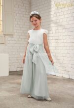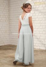 Mono de ceremonia en tul. El cuerpo es sin mangas, de tul en blanco roto y el pantalón en color verde agua. La espalda es de escote cuadrado, con una bonita puntilla.
