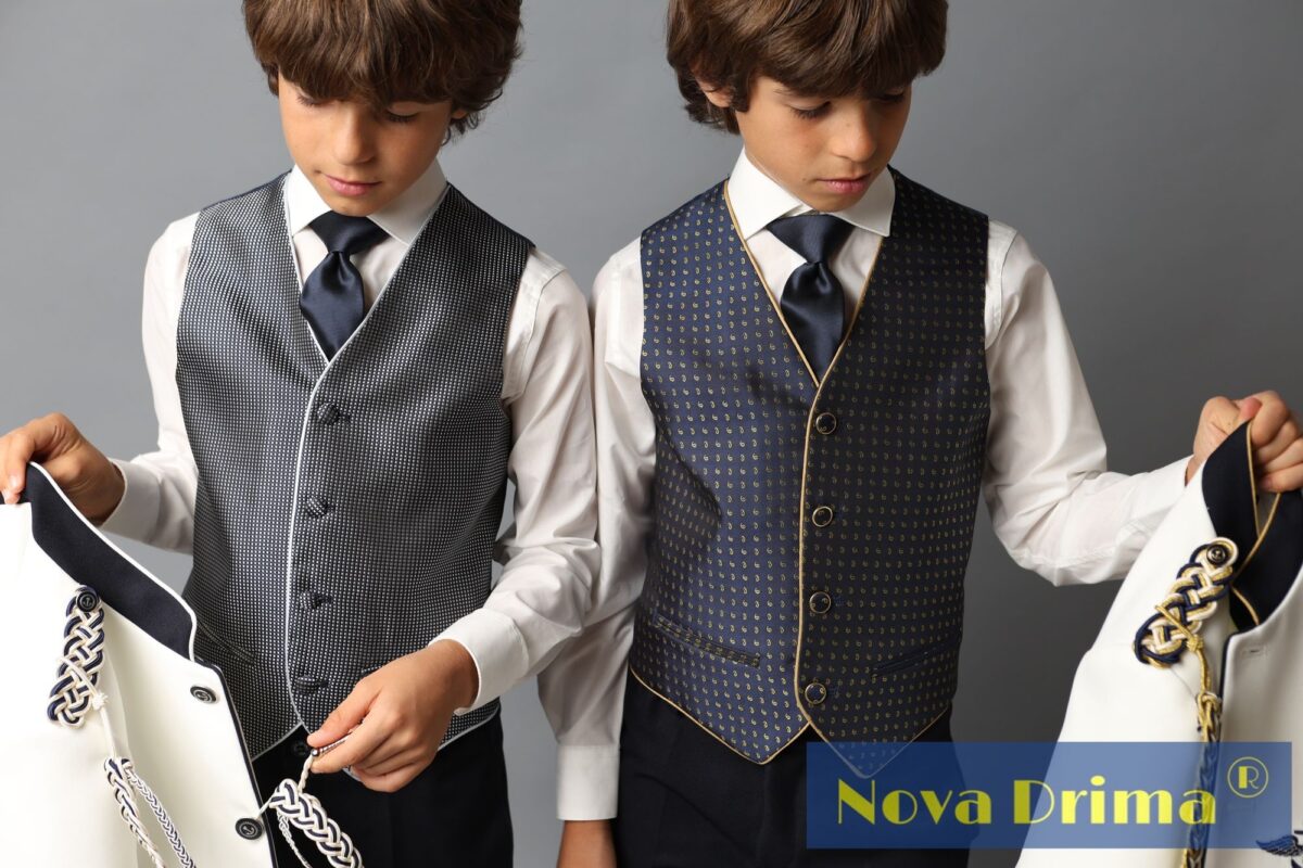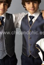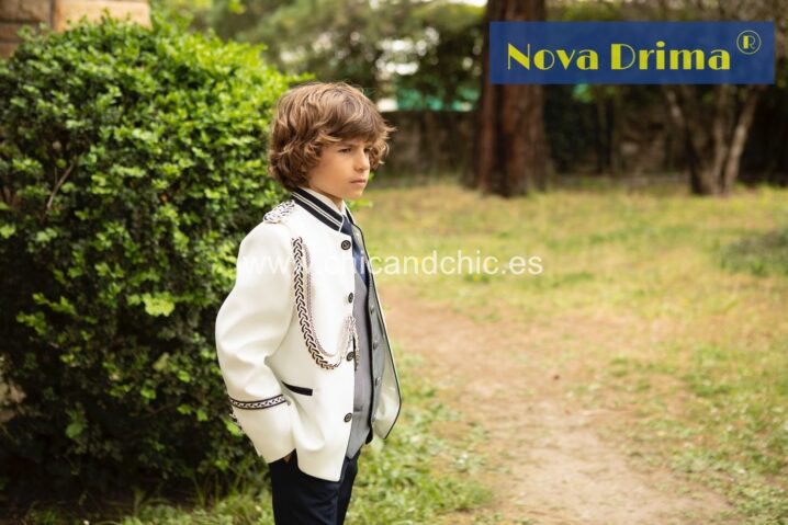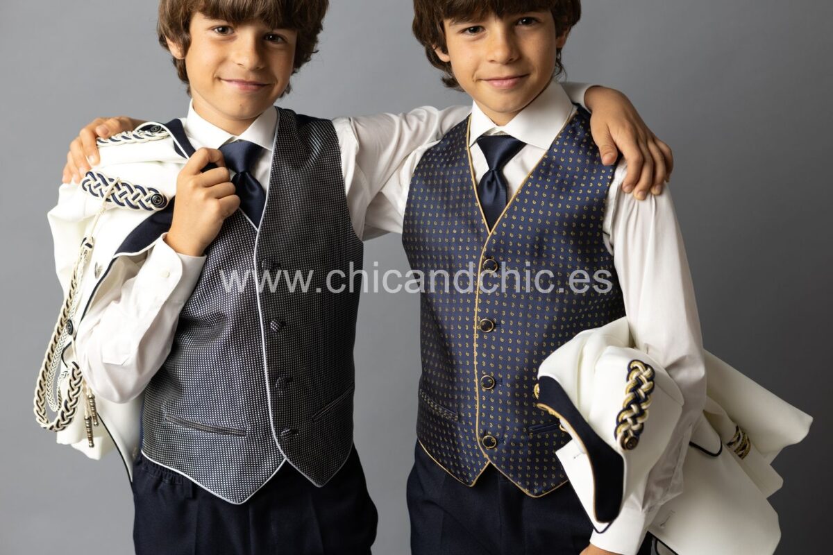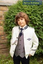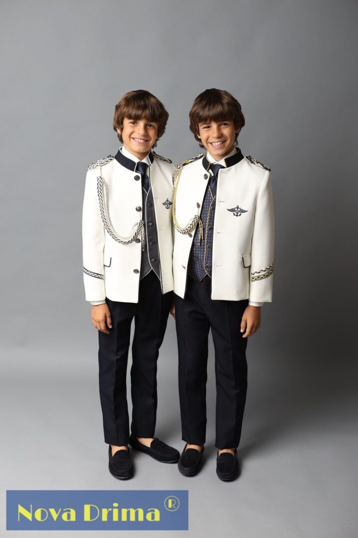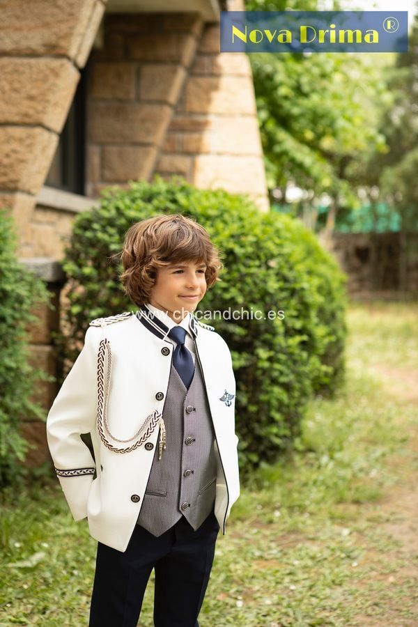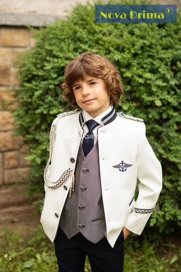 Almirante de una fila cuello mao tipo. La casaca es en beige, con galones, forrajeras en tonos marino-plata; el chaleco es a cuadritos en marino con plata y la corbata es lisa en marino.