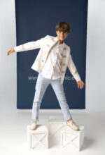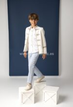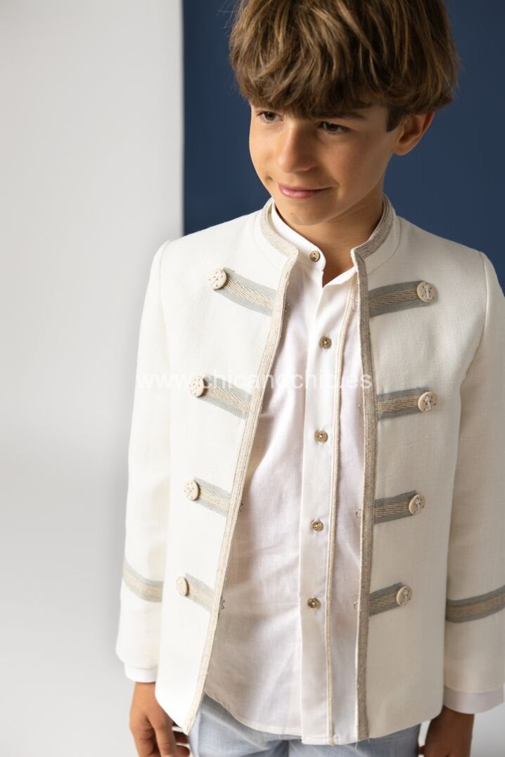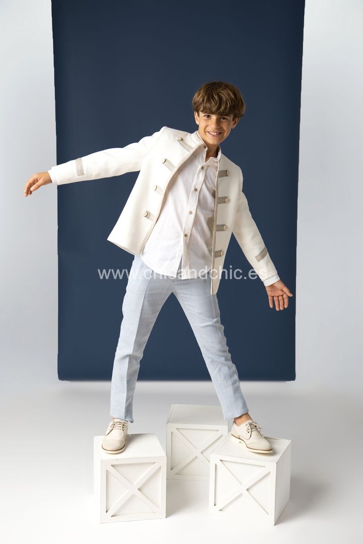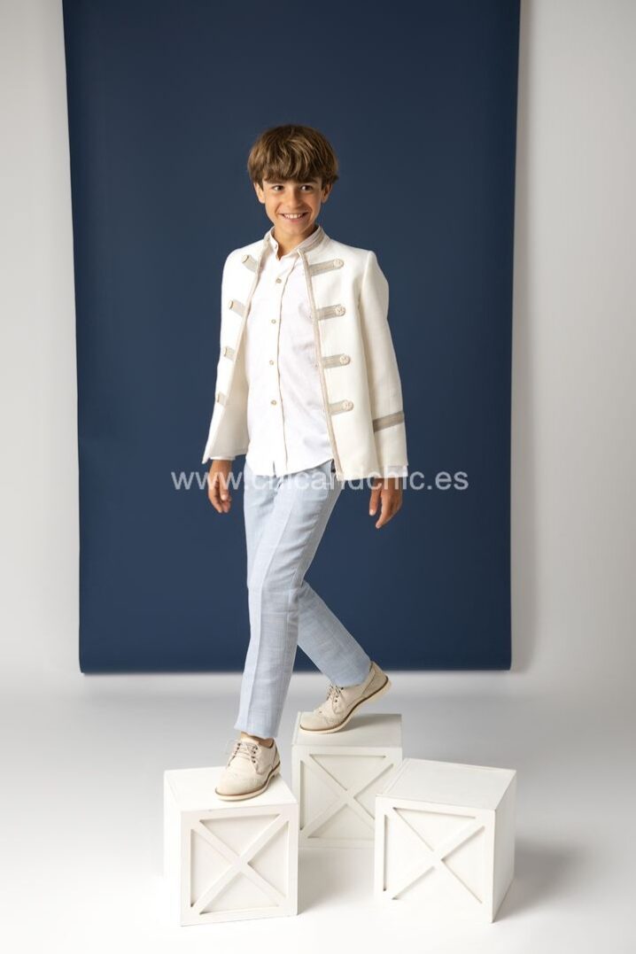 Almirante de una fila cuello mao tipo casaca. De lino, el pantalón es en azul, y la casaca en tono crudo con botonadura en azul celeste. Lleva una camisa cuello mao.