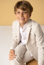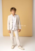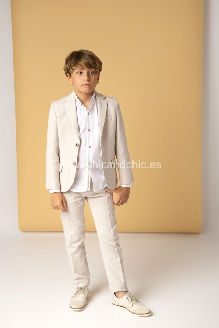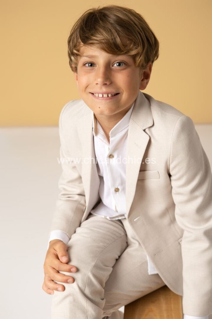 Traje de niño todo beige, con americana de solapa y camisa lino cuello mao blanco roto.
