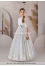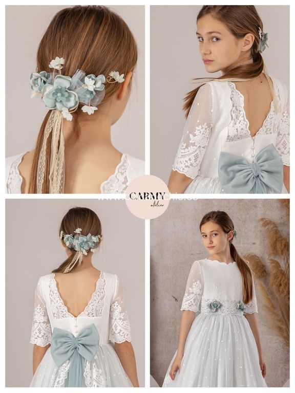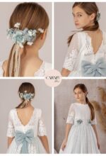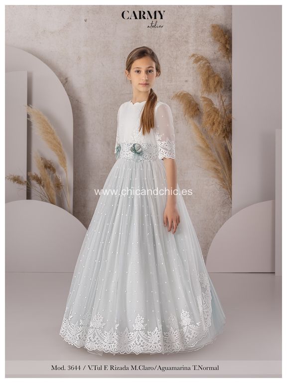 Vestido de comunión en tul bordado. El cuerpo lleva un cuello en ondas, con algo de tul bordado, en color crudi. La falda es toda en tul bordado, con color verde agua. El escote trasero es a pico, y lleva un fajín con lazada trasera en tul verde agua. Lleva dos adornos florales en la parte delantera.