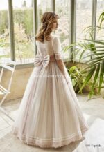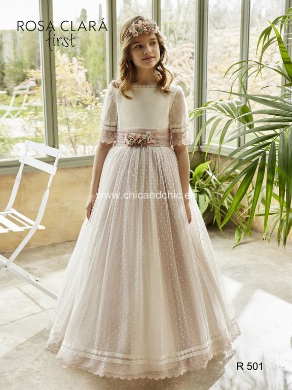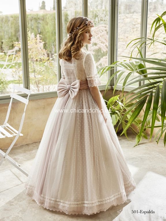 Vestido de comunión estilo romántico en tul plumeti; escote y espalda cuadrado, manga tres cuartos; fajín de tul con pomo de flores y falda fruncida en tono rosa maquillaje.