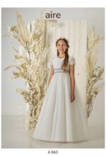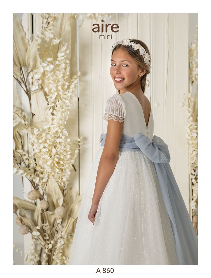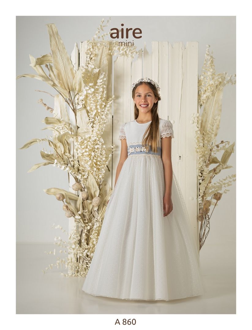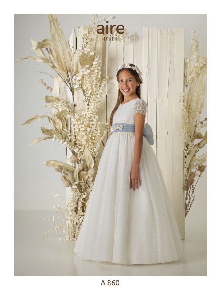Vestido de comunión en tul bodoques color marfil. Es de manga corta drapeada, con el cuerpo liso y la falda en tul de bodoques. El escote es a pico y el cinturón color azul con lazada trasera.