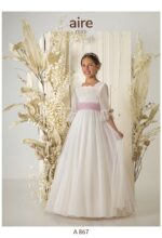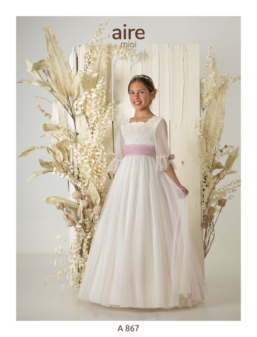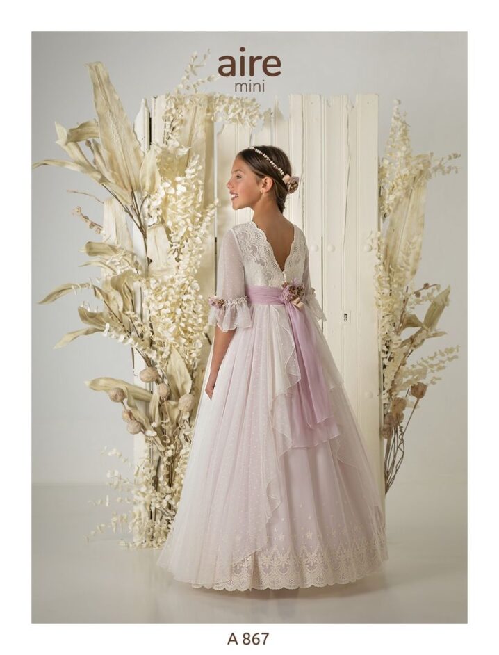 Vestido de comunión en tul bordado marfil. Es de manga francesa, con el cuerpo bordado, y la falda en tul dibujo. Tiene una preciosa falda con apertura en la parte trasera, con volante que abre al tul bordado y un lazo en color rosa. La espalda es a pico en tul bordado.