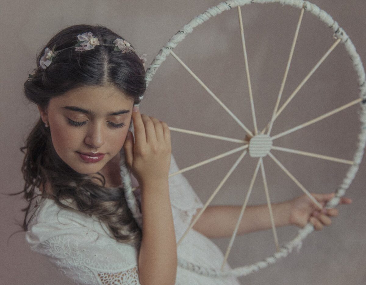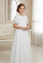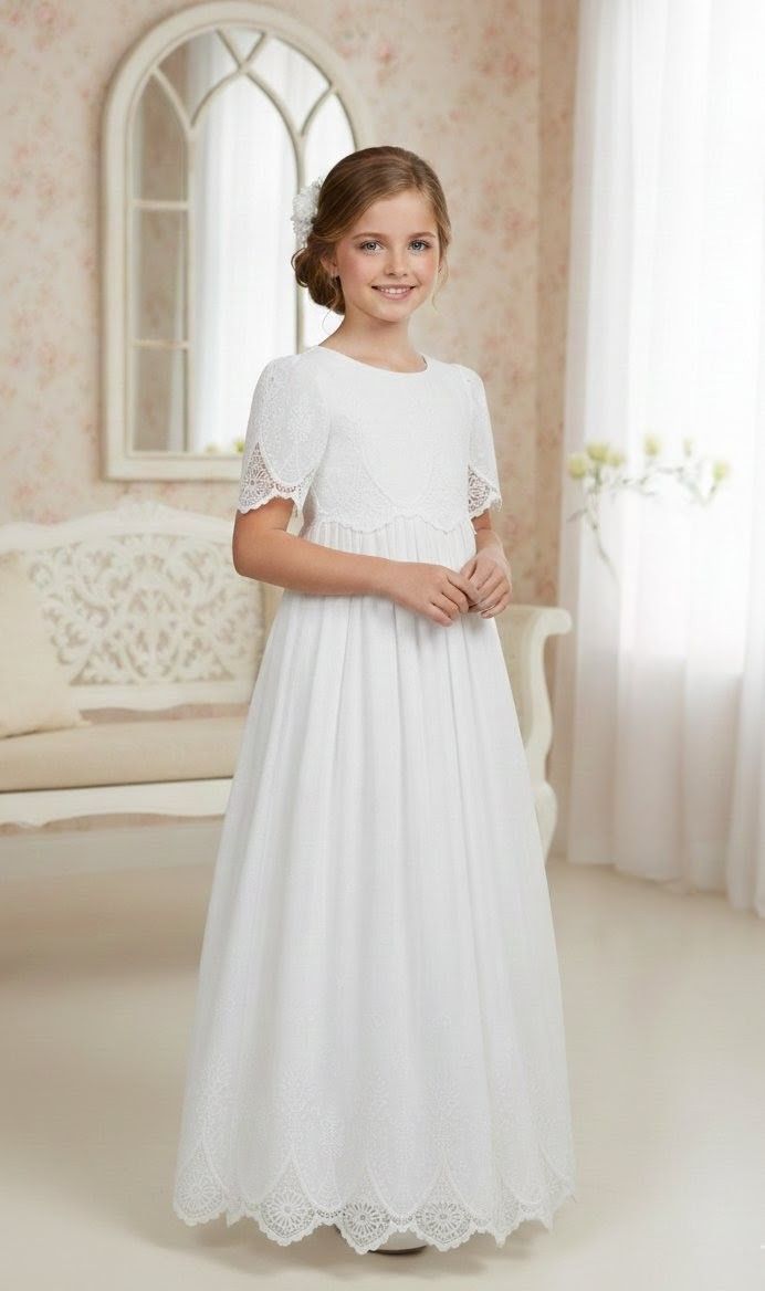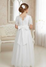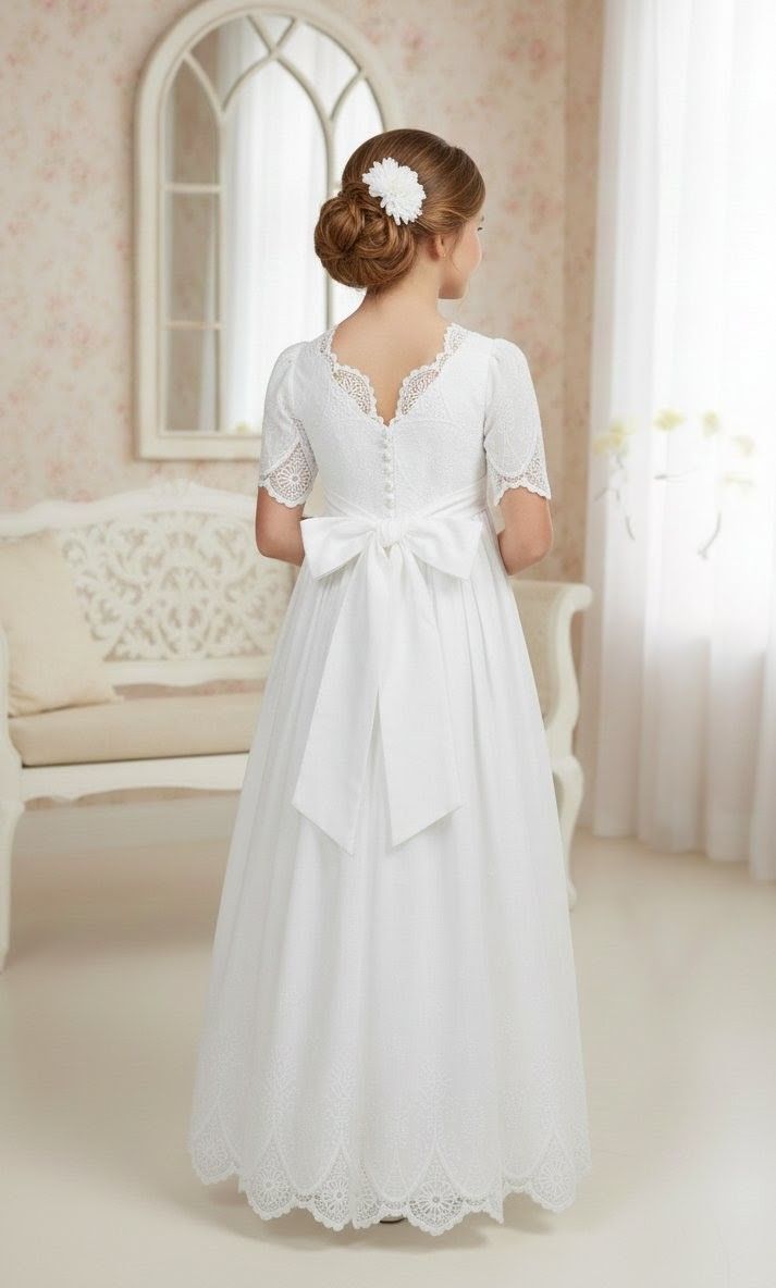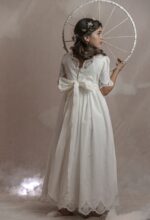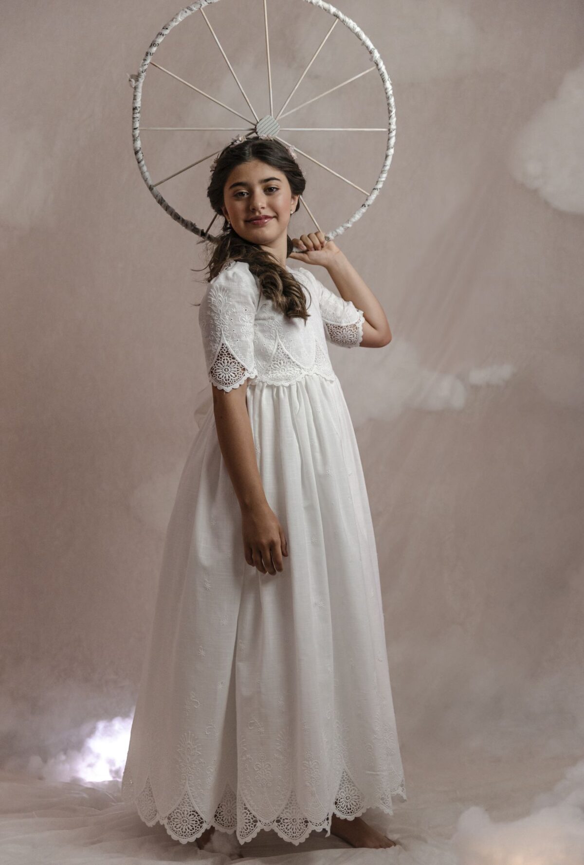 Vestido de comunión de manga al codo en blanco. Es de LINO con un precioso bordado en el cuerpo, espalda, manga y bajo de la falda. Todo al tono