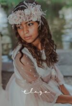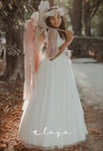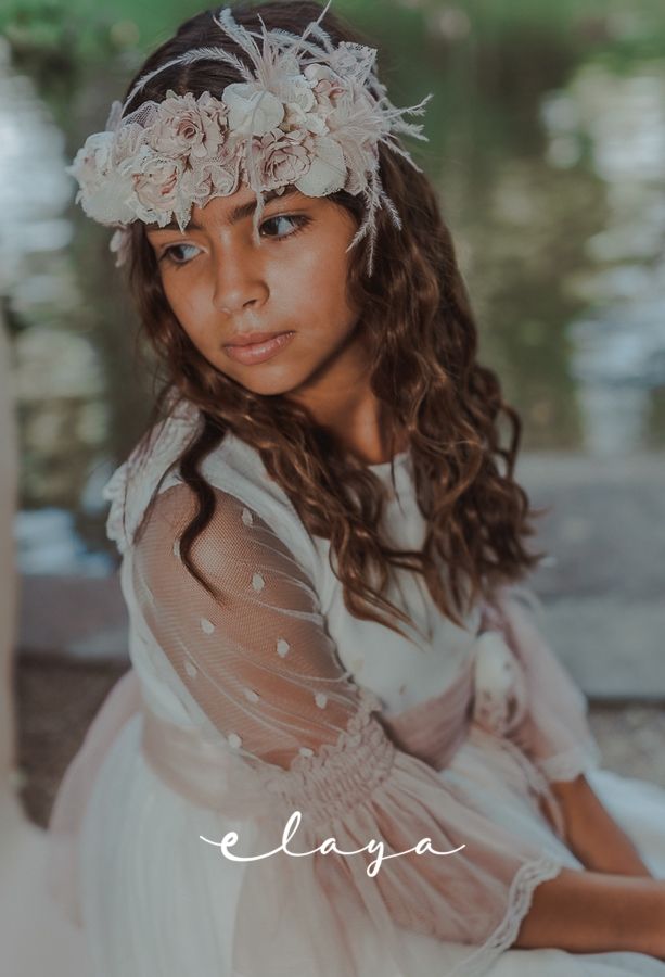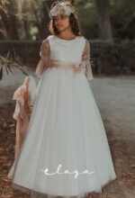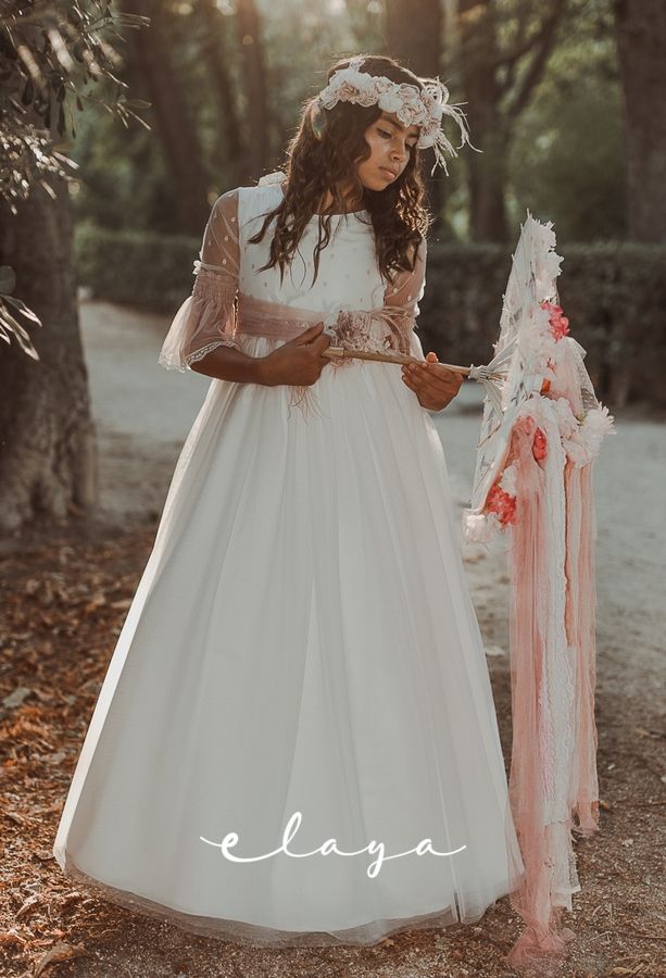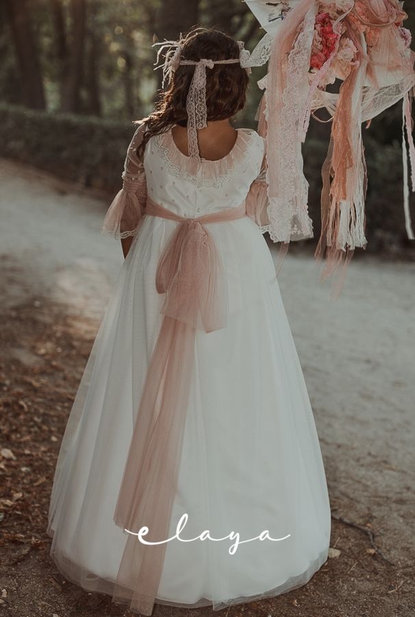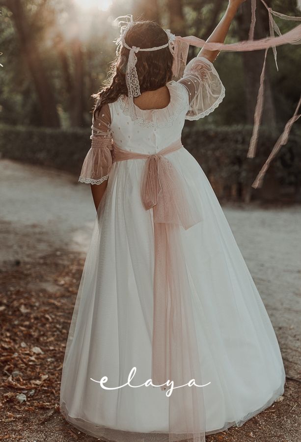 Vestido de comunión en tul. El cuerpo es de tul de topos en tono rosa. Lleva manga francesa, con un acabado en tul de color rosa, al igual que el fajín de la cintura. La espalda es con escote redondeada, con un precioso volante en tul rosa, rematado con puntilla. La falda es de tul en color blanco roto.