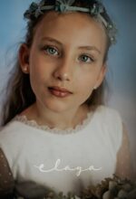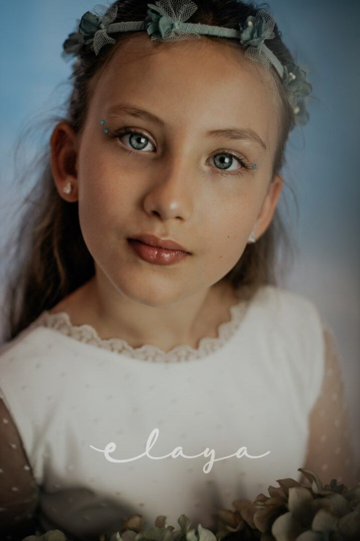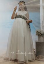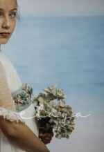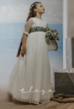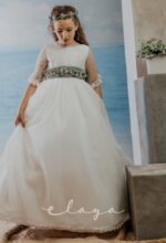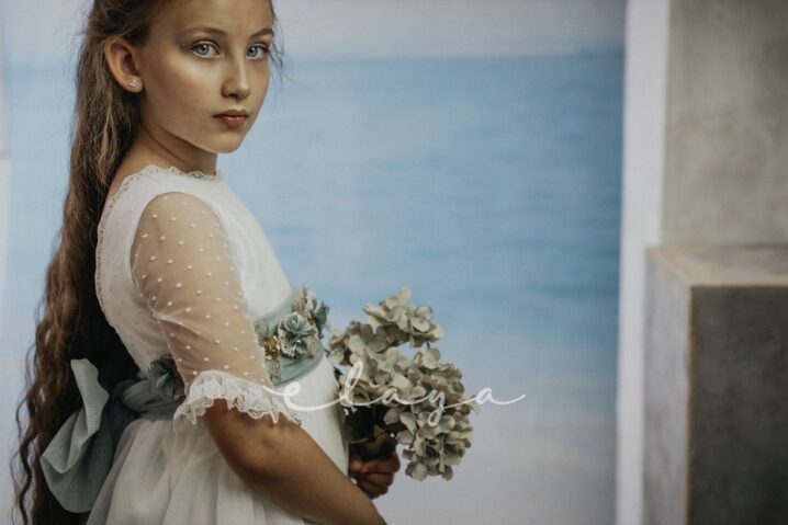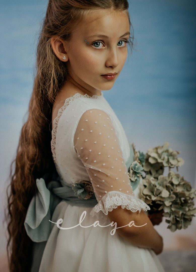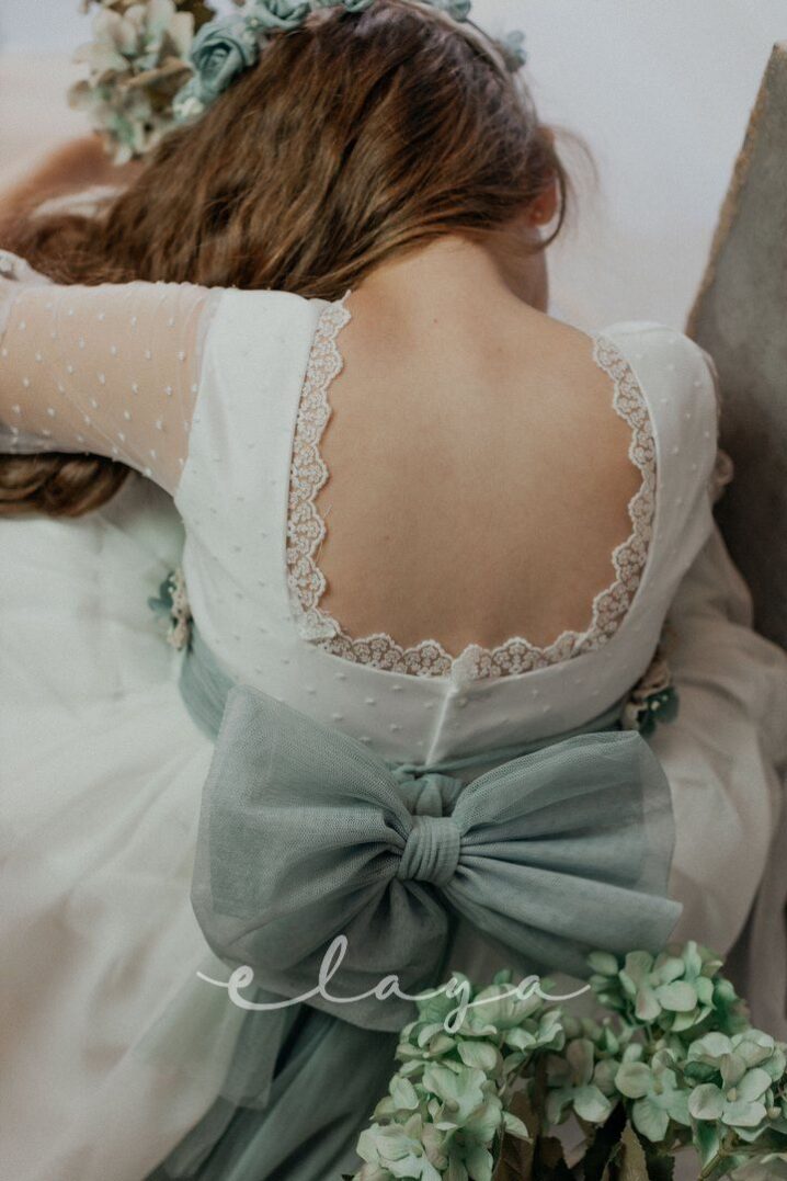 Vestido de comunión organza MANUELA. Blanco roto-verde agua.
