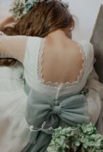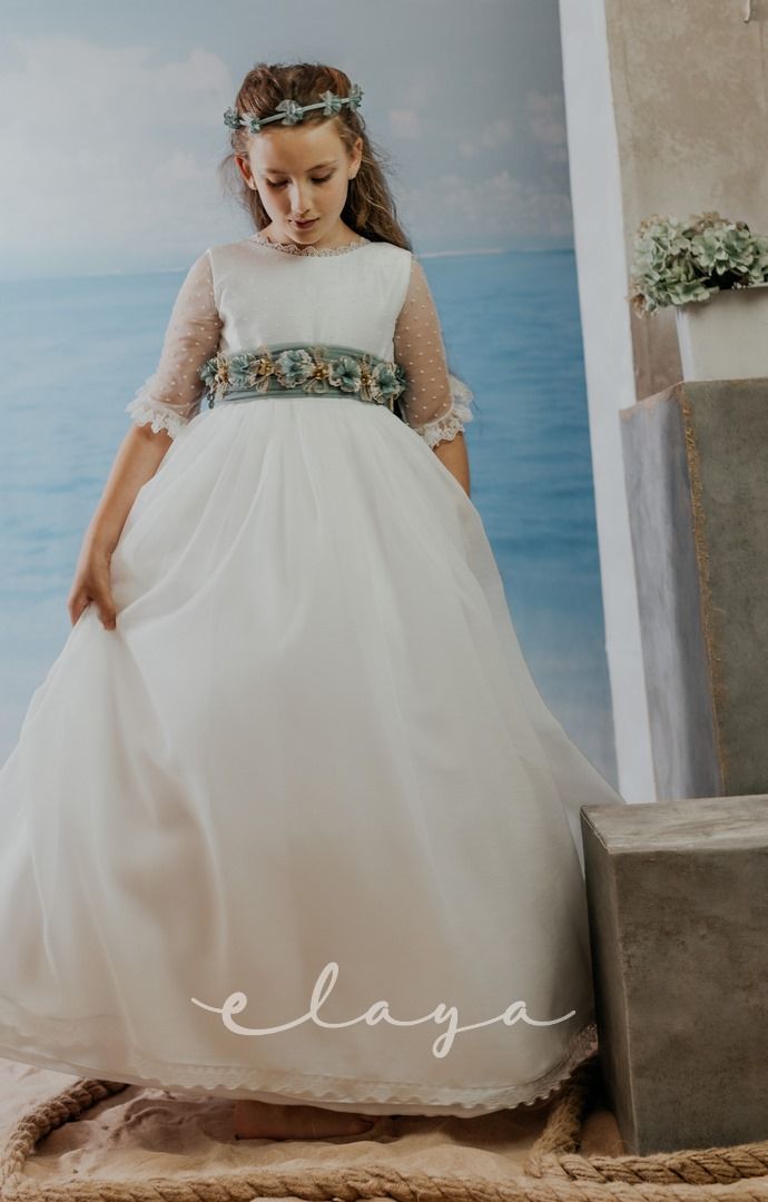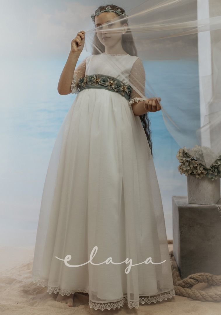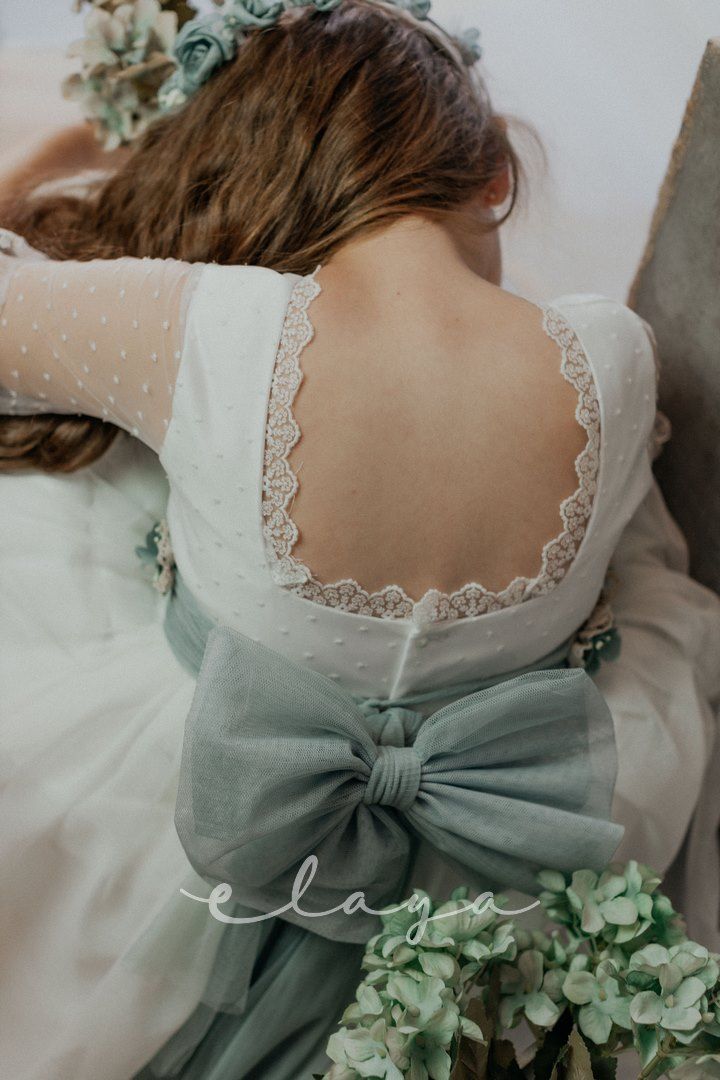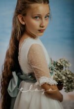 Vestido de comunión en organza. El cuerpo es de tul, con topitos bordados en hilo de algodón. Es de manga francesa con una bonita puntilla en la manga, al igual que en la falda del vestido. Lleva un fajín en tul verde agua, acabado con una bonita lazada ya hecha.