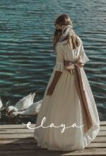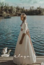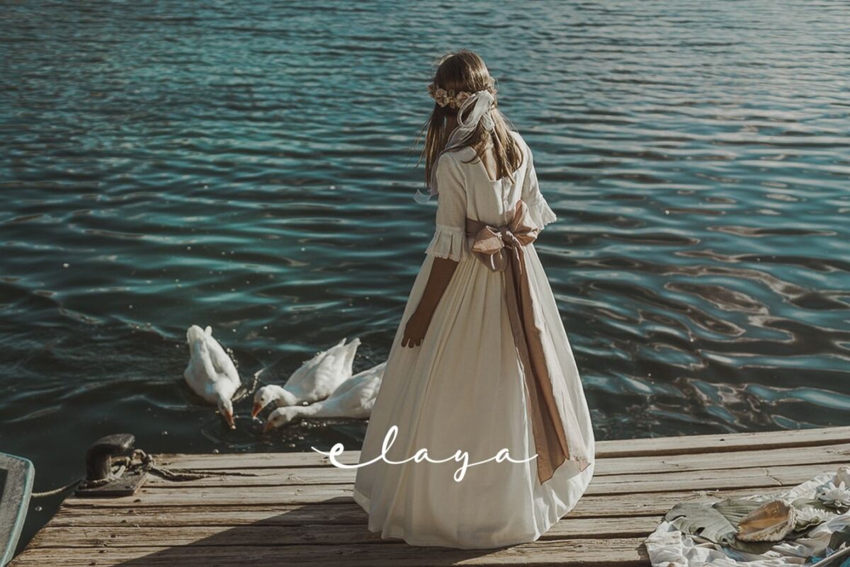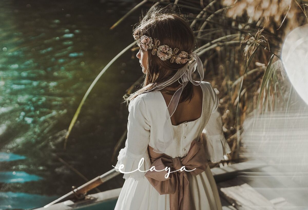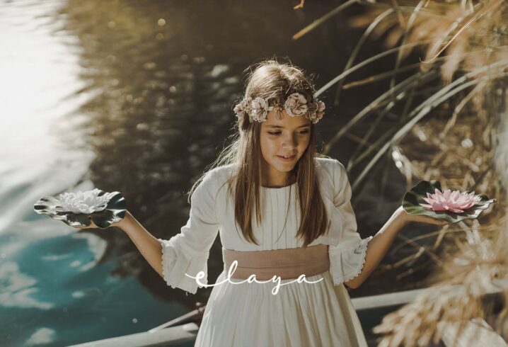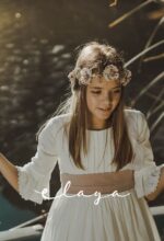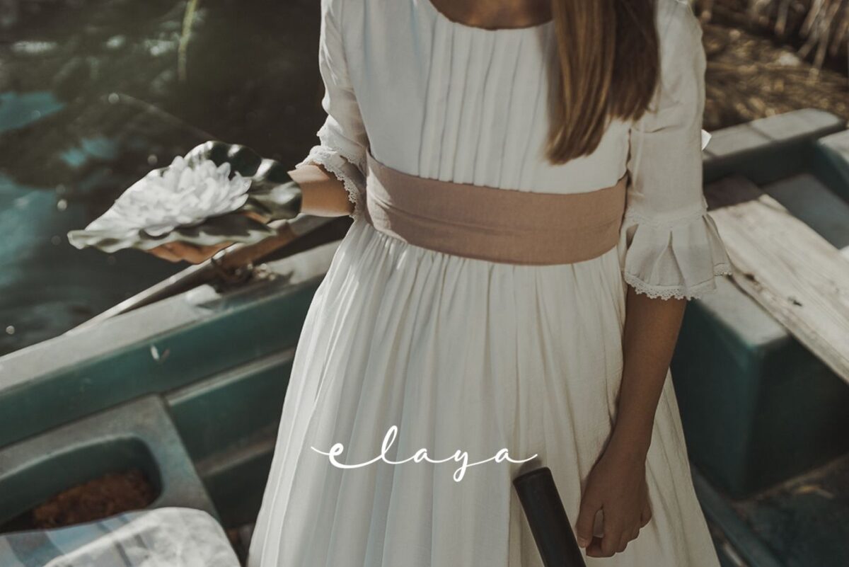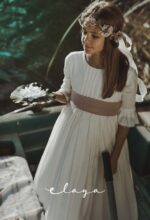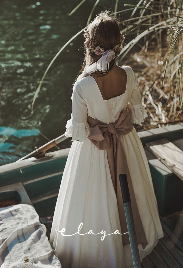 Precioso vestido de comunión en manga francesa. Todo en un jacquard de algodón, lleva un cuerpo con tablitas verticales. De corte a la cintura, lleva un fajín en lino rosa maquillaje que va atada con gran lazada atrás. El escote es cuadrado, siendo así más original.