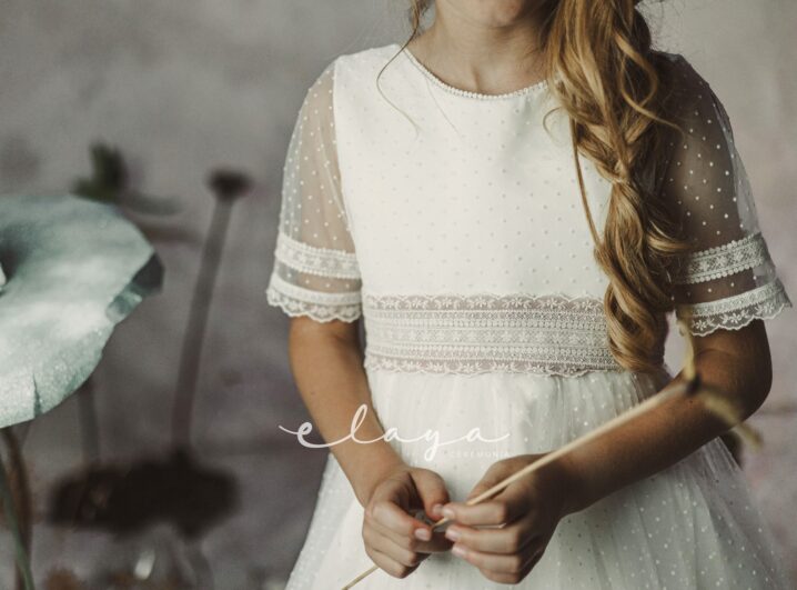 Vestido de comunión en tul motitas. El vestido es de manga francesa blanco roto.. La espalda es de escote cuadrado con parte trasnparente. Lleva unas bonitas puntillas en las mangas, espalda y falda.
