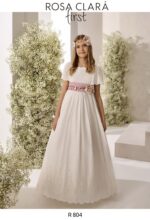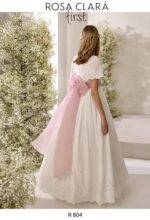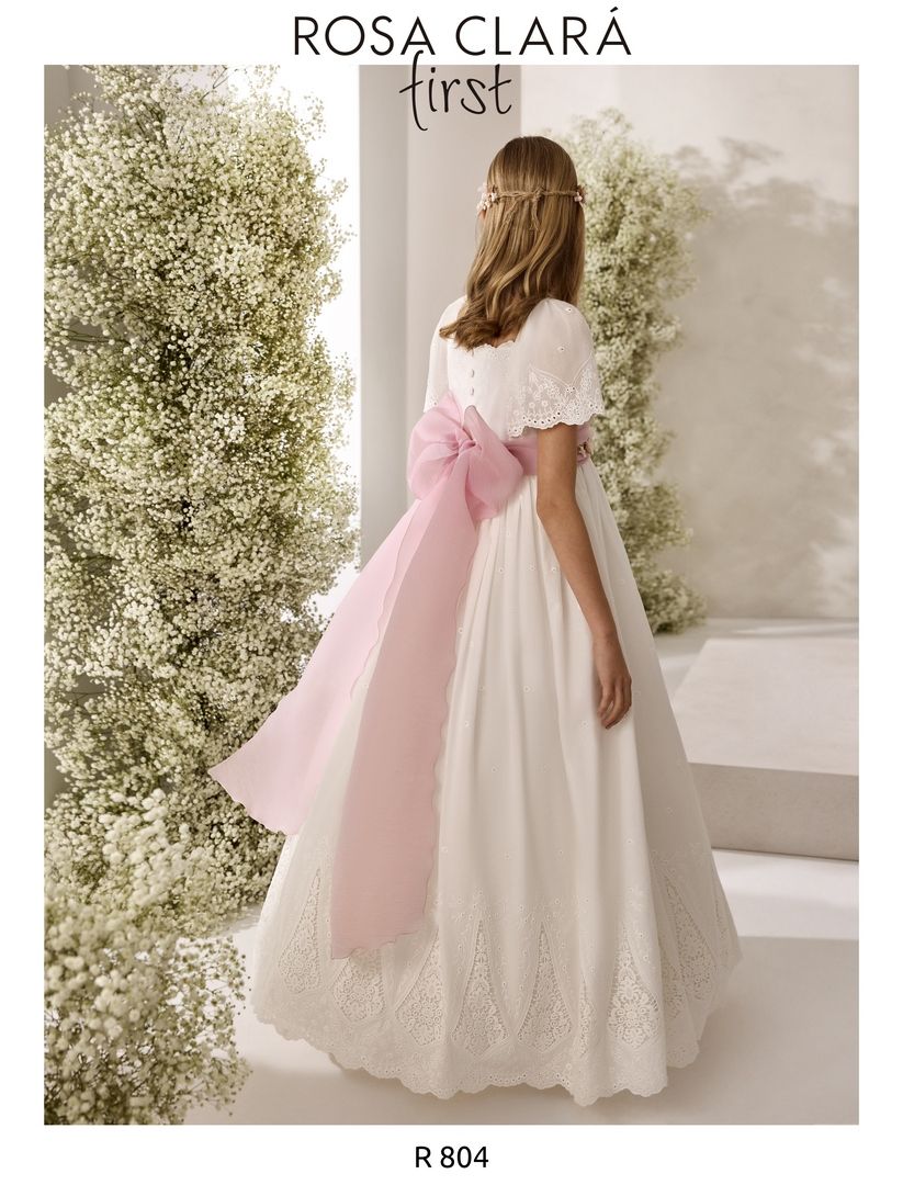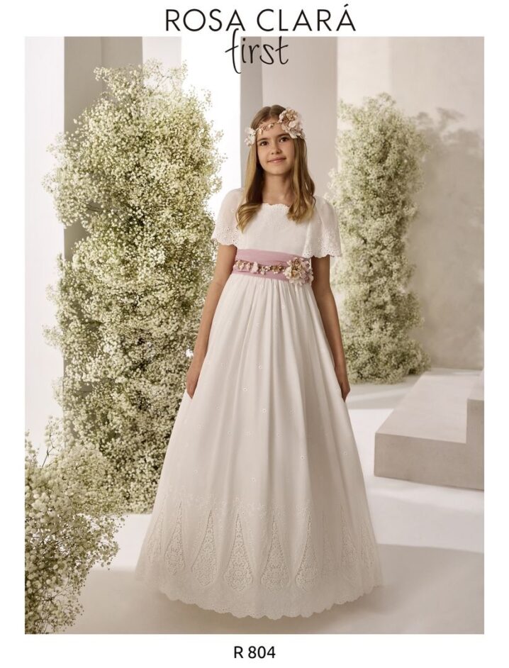 Precioso vestido de comunión en batista bordada color natrual. Lleva una elegante manga abullonada, y la falda va lleva la terminación del bordado con un precioso dibujo. El fajín es en color rosa, y lleva lazada trasera.