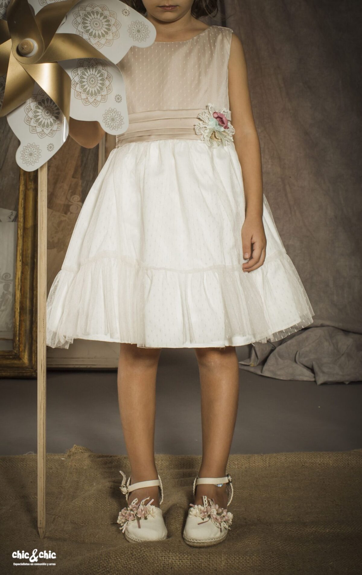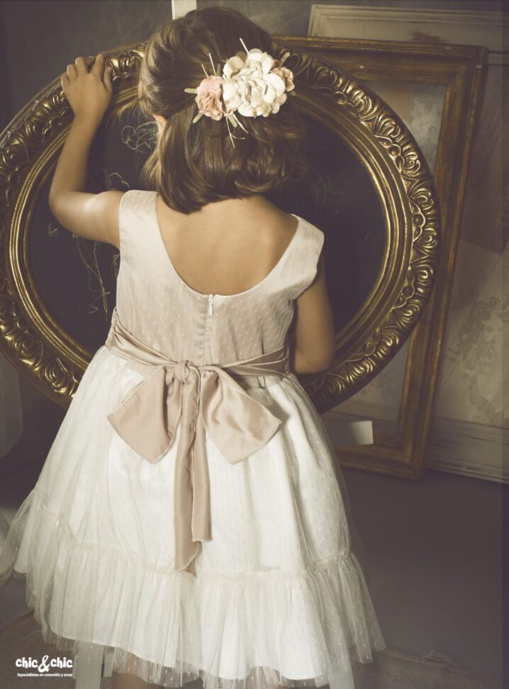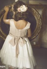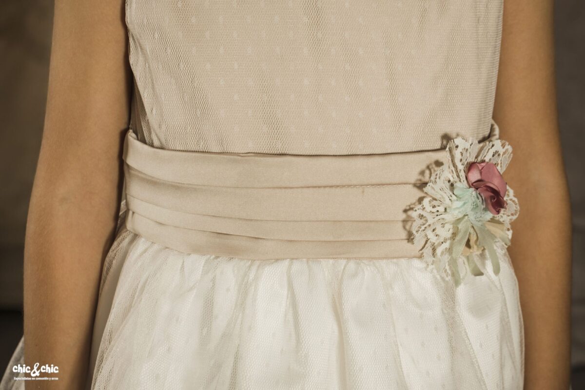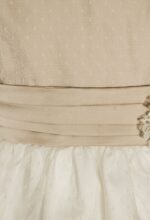 Precioso vestido en tul plumeti. El cuerpo es tostado, y lleva un fajín en el mismo color. La falda es de frunce y en color blanco roto, con un pequeño volante en su terminación.