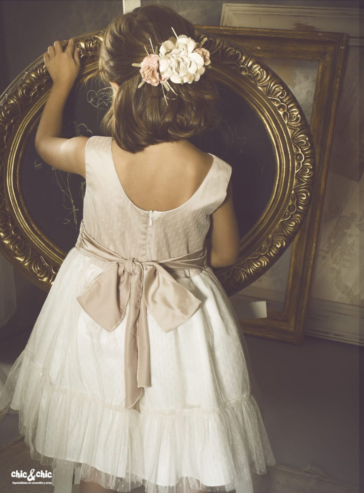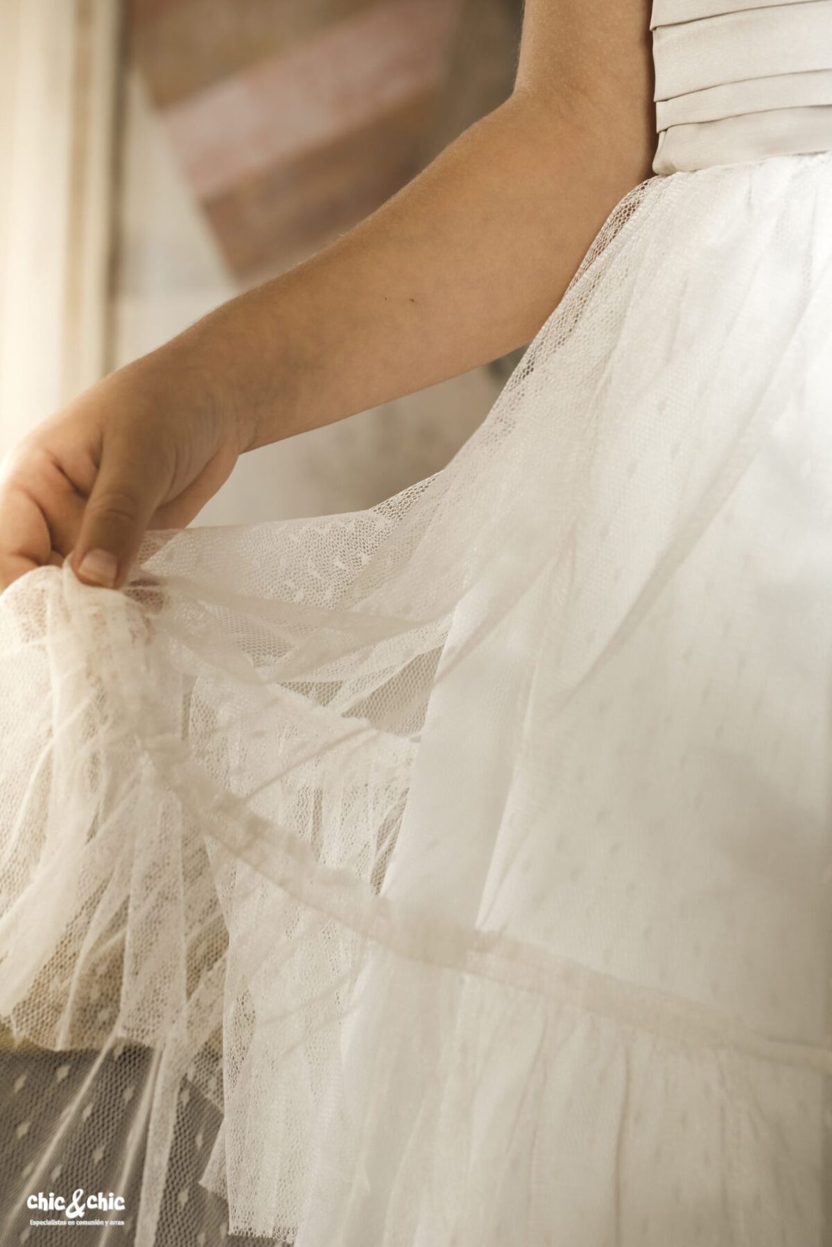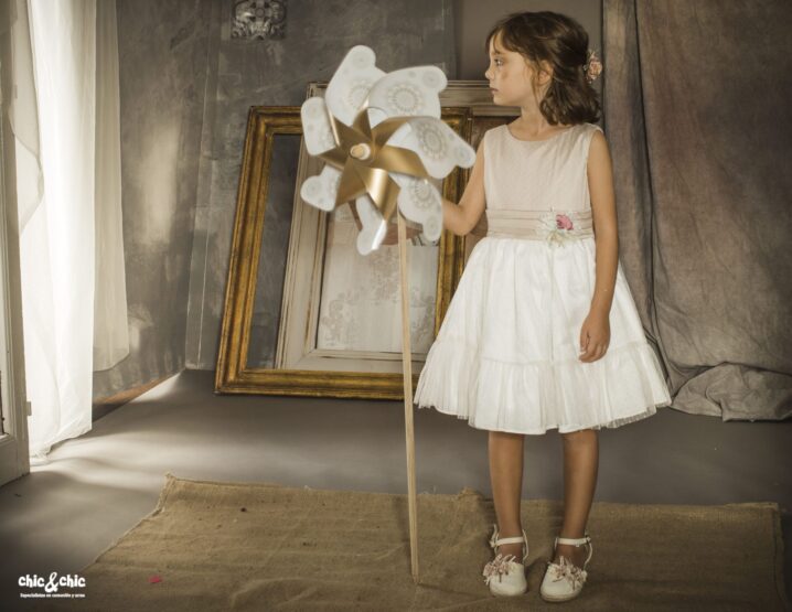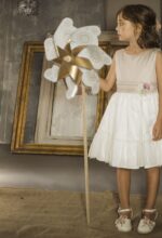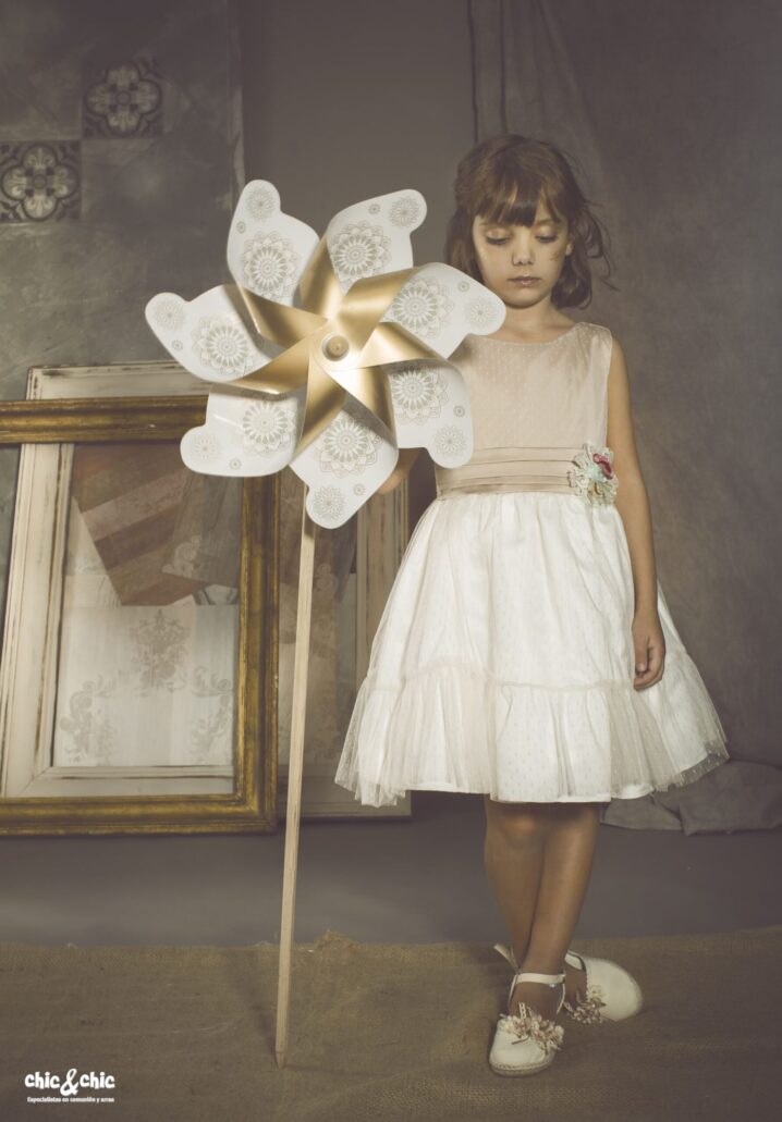 Precioso vestido en tul plumeti. El cuerpo es tostado, y lleva un fajín en el mismo color. La falda es de frunce y en color blanco roto, con un pequeño volante en su terminación.