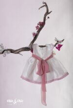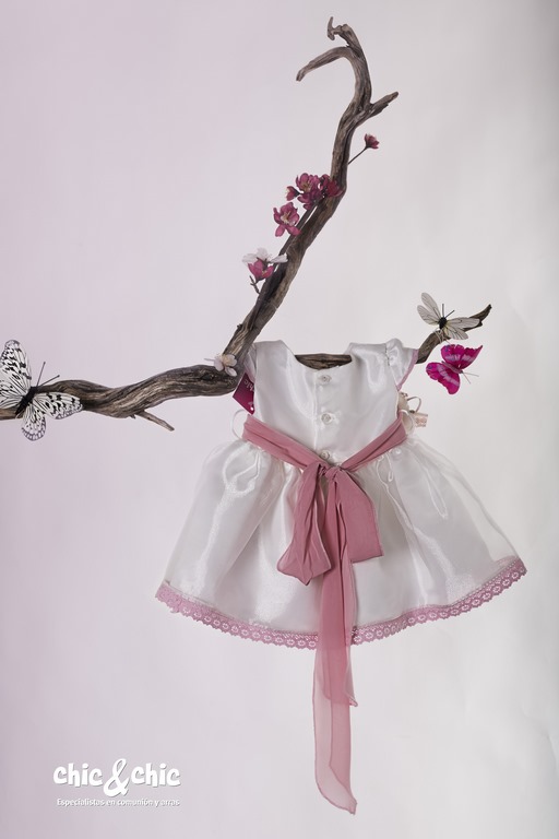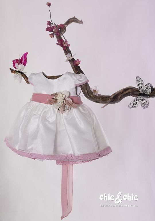 Vestido de ceremonia en organza. Es de manga corta, con una puntilla rosa tanto en manga como en bajo de la falda. Es de corte a la cintura, con la falda fruncida y el fajín en tono rosa, con detalle floral en un lado.