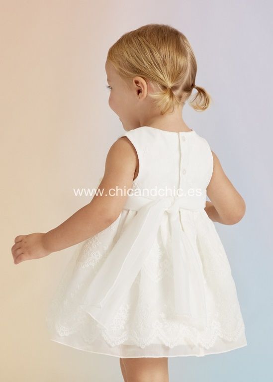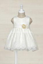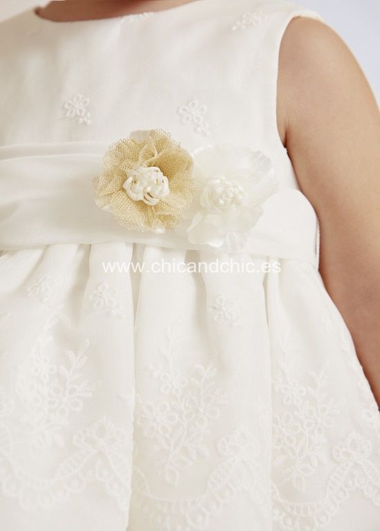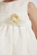 Vestido de ceremonia de organza bordada de flores color blanco roto. Lleva flor en el fajín