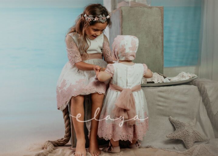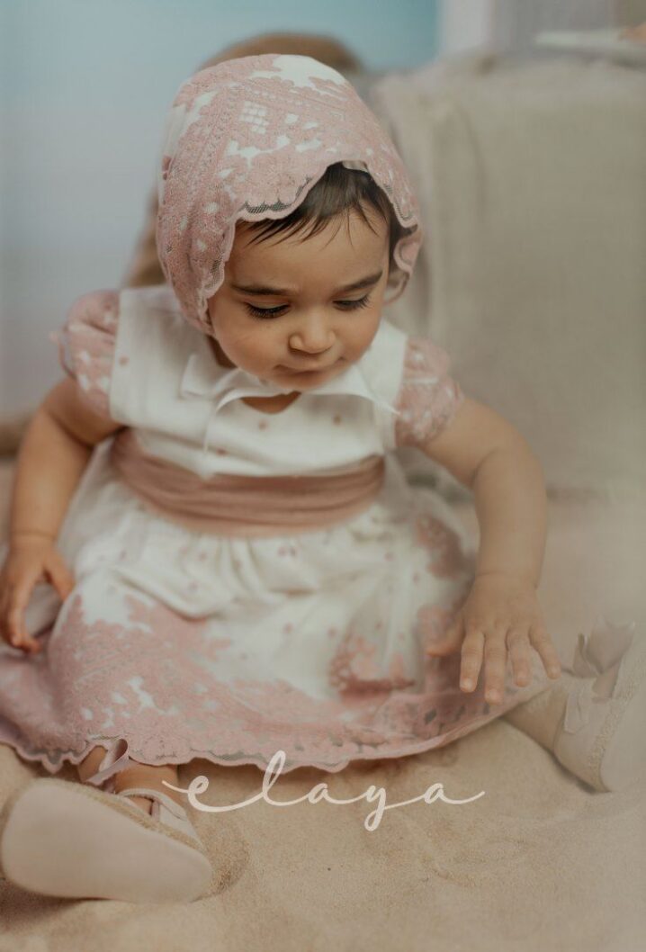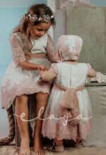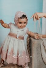 Vestido de ceremonia manga corta  y tul bordado rosa.