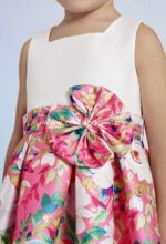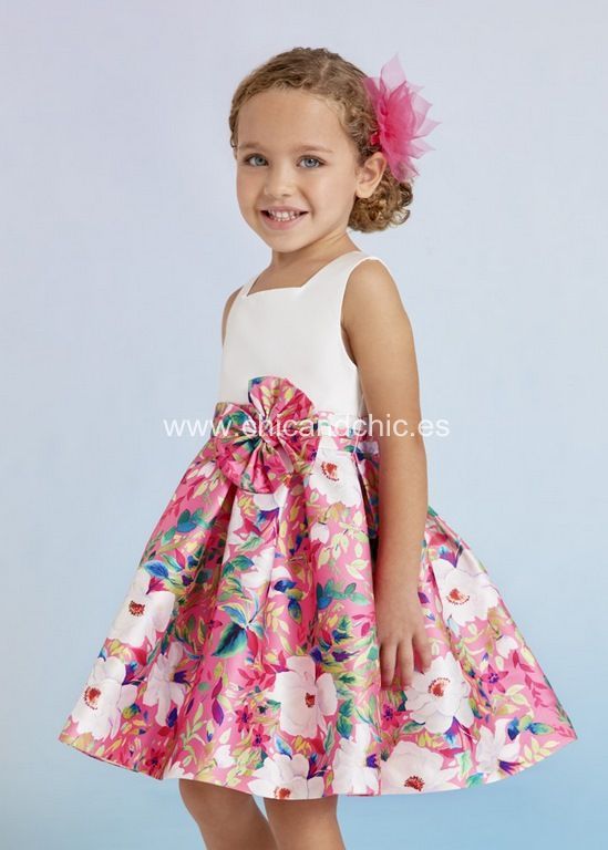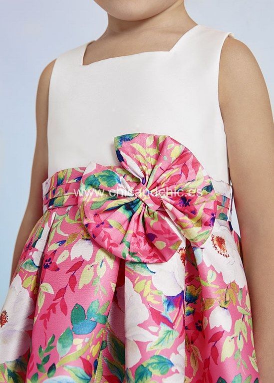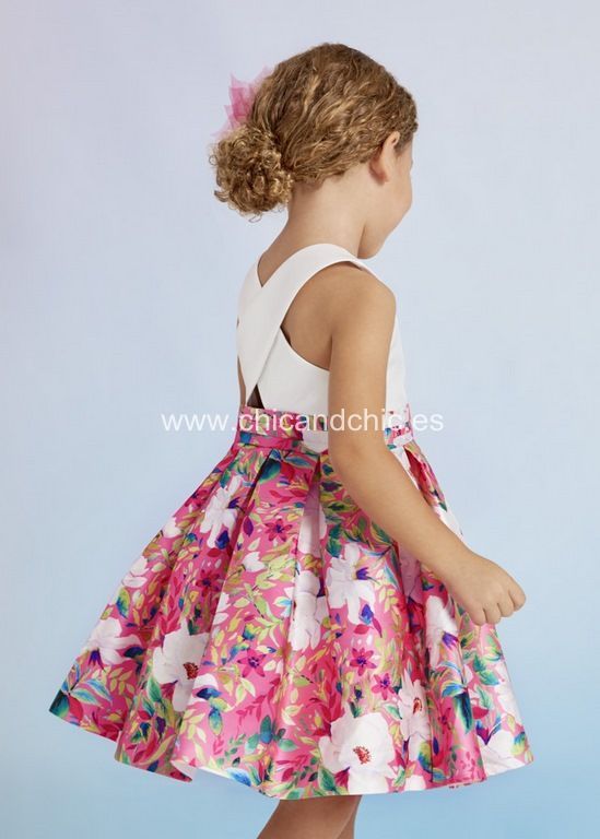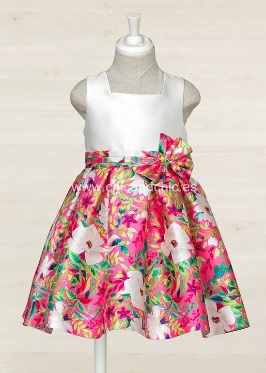 Vestido de ceremonia  de mikado estampado en colores fresas.