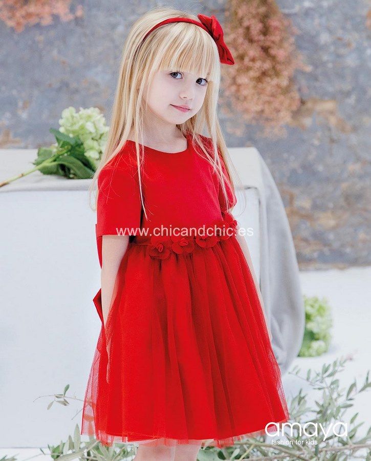 Vestido de ceremonia en terciopelo rojo manga larga y tul rojo en la falda.