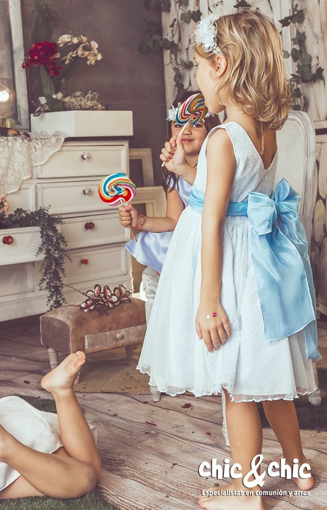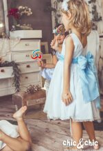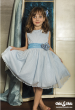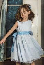 Precioso vestido en tul de topos en color azul celeste . Sin mangas y de corte a la cintura. La falda es fruncida, y, lleva un fajín en organza y crep en un tono más subido al del vestido para que destaque un poco.