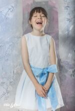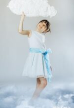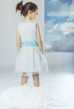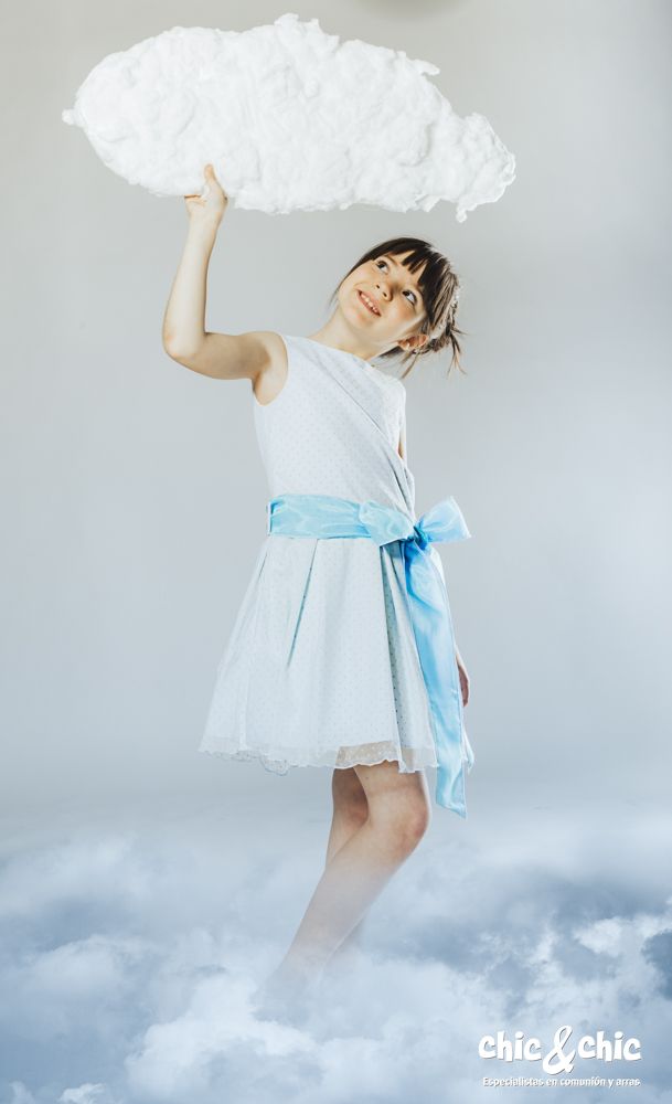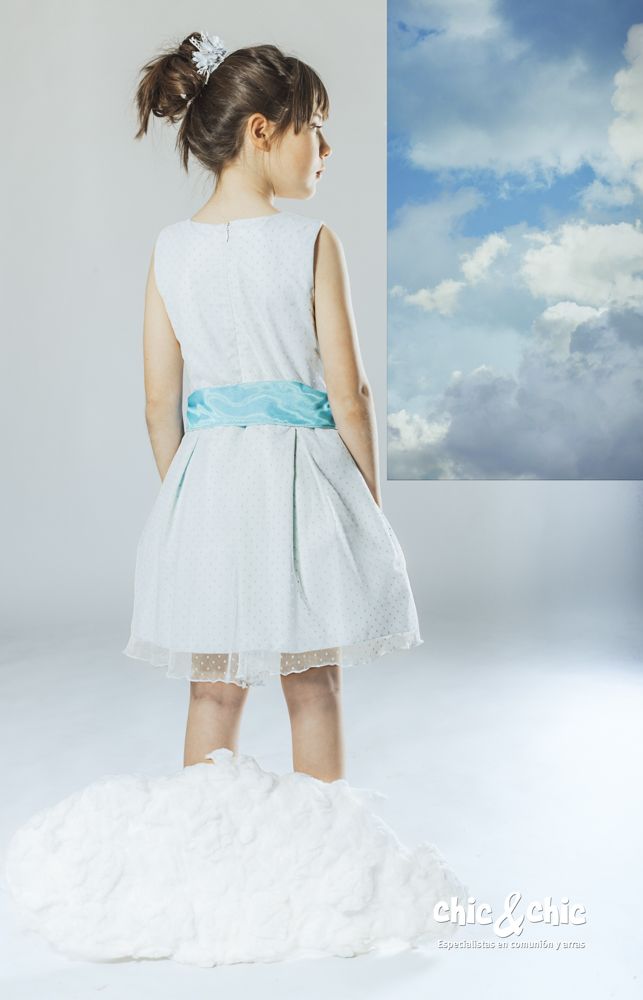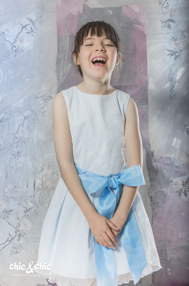 Precioso vestido en tul de topos en color azul . Sin mangas y de talle bajo. La falda es de tablas, y, lleva un lazo delantero en organza en color azul más fuerte.