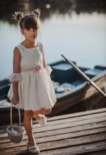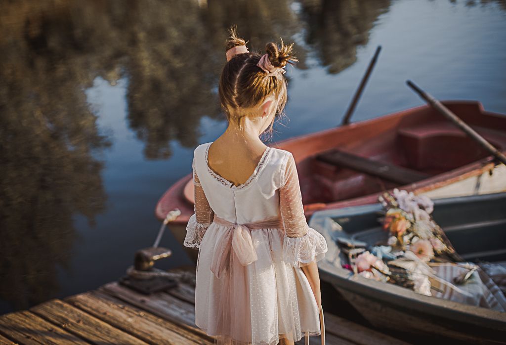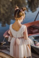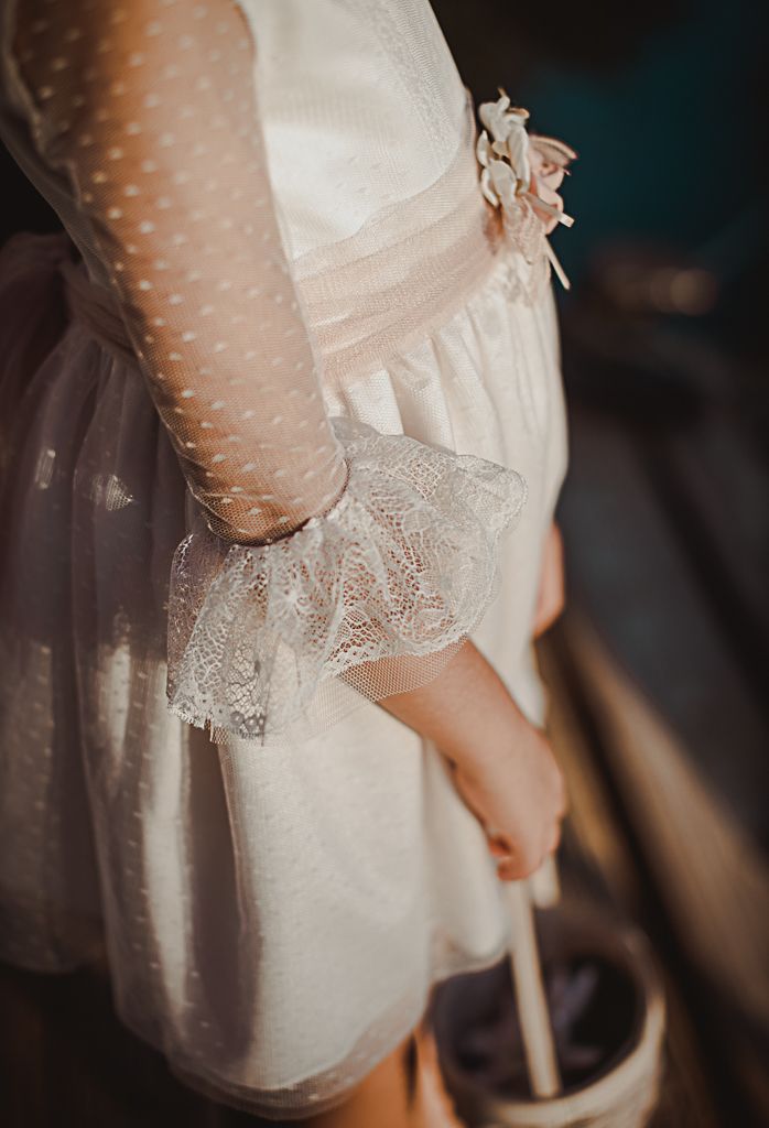 Vestido de cEREMONIA en tul chispitas. Es de corte a la cintura con manga francesa. El cuerpo, de color blanco roto, lleva unos adornos de puntilla, al igual que la terminación de las mangas. El fajín es azul celeste, al igual que la falda. La espalda lleva escote a pico redondeado.