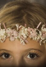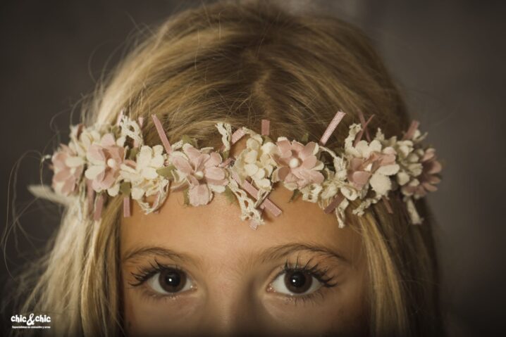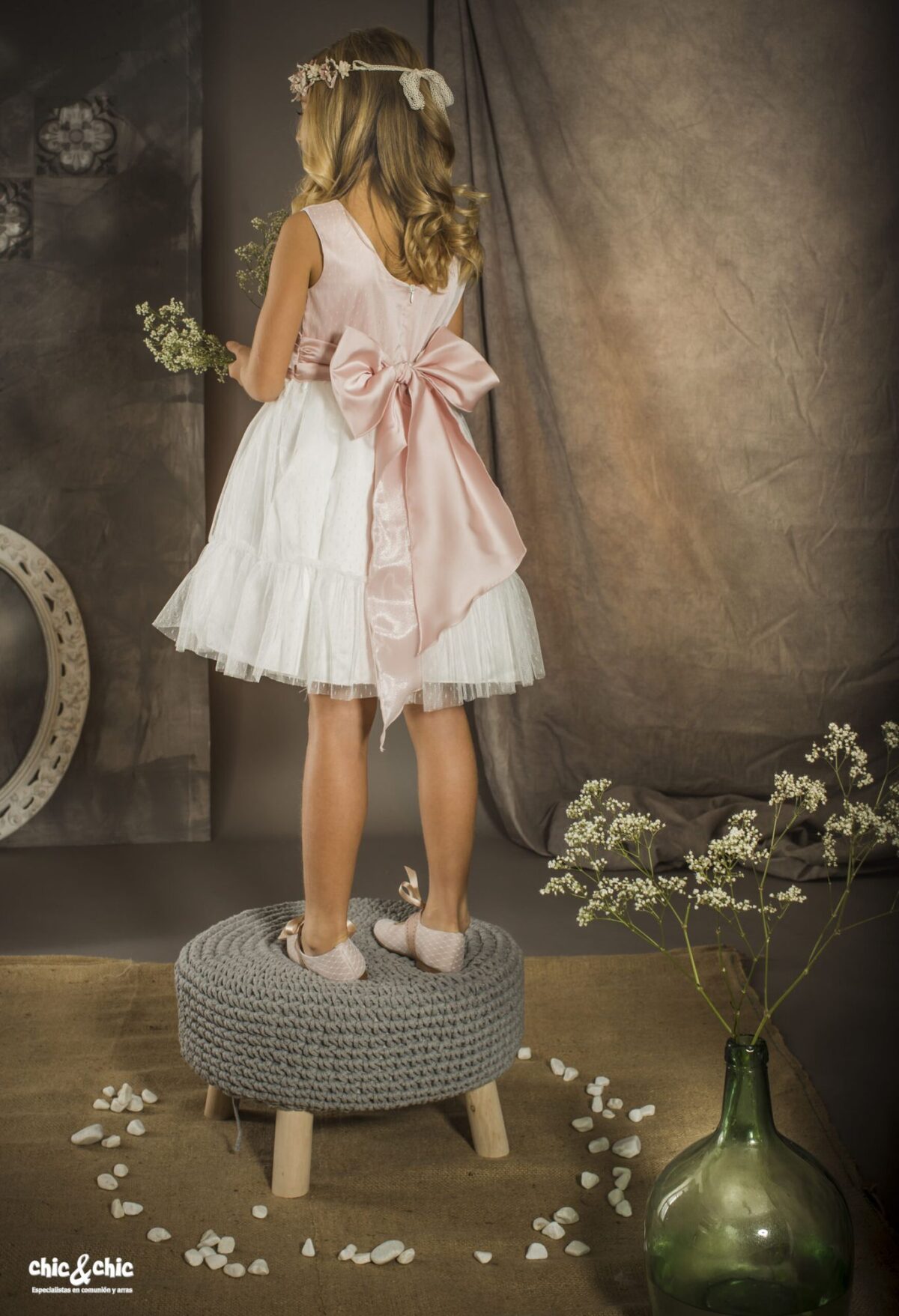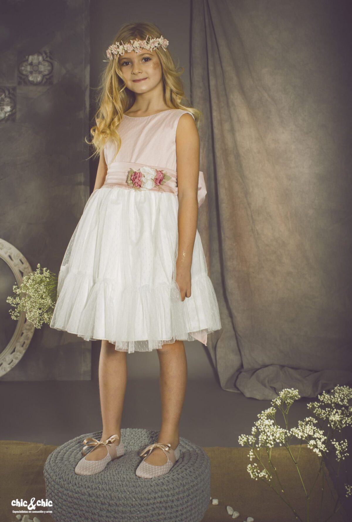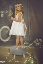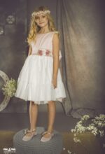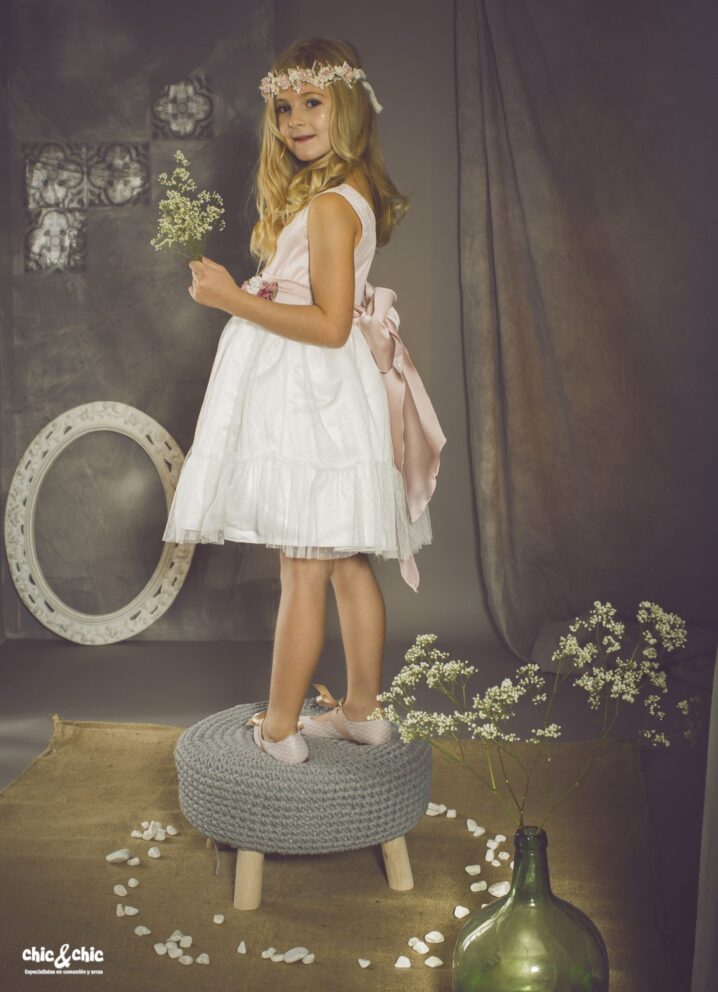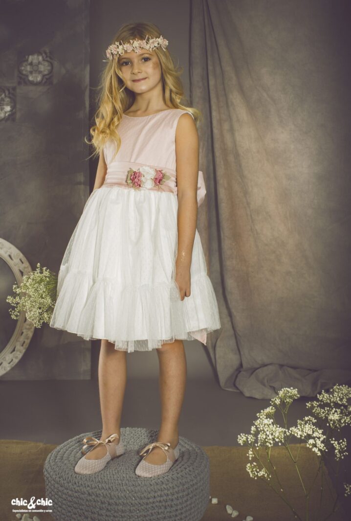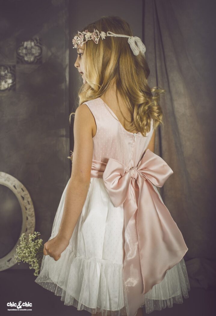Precioso vestido en tul plumeti. El cuerpo es rosa, y lleva un fajín en el mismo color, decorado por un adorno floral en un lado. La falda es de frunce y en color blanco roto, con un pequeño volante en su terminación.