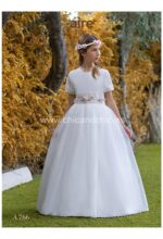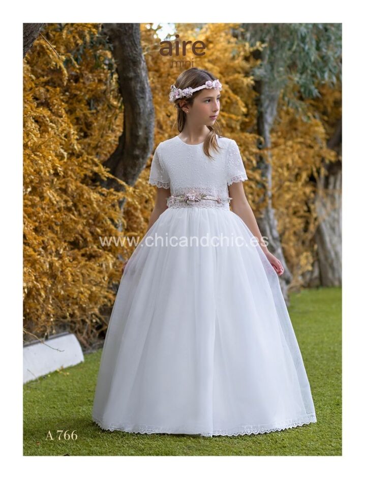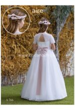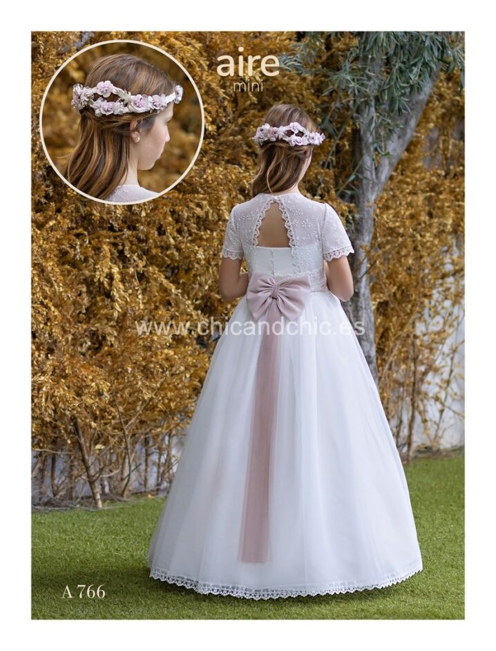 Vestido romántico de manga corta de tul bordado y gasa. Todo en blanco roto, el cuerpo es tul bordado muy bonito, con una espalda abierta, y la falda es de gasa lisa rematada con puntilla. Fajín en tul rosa con lazo hecho en el mismo color.