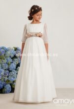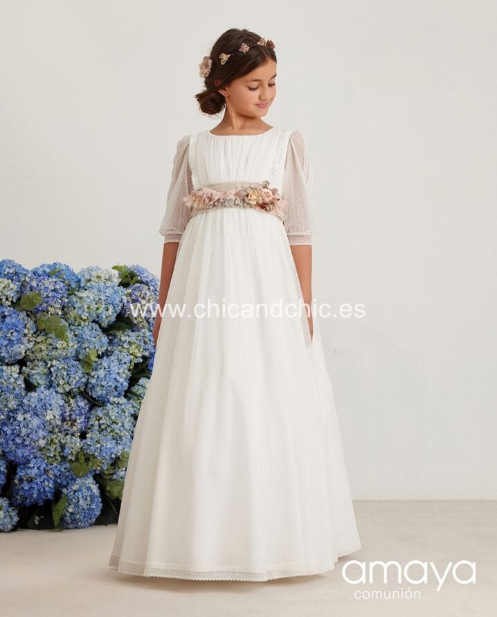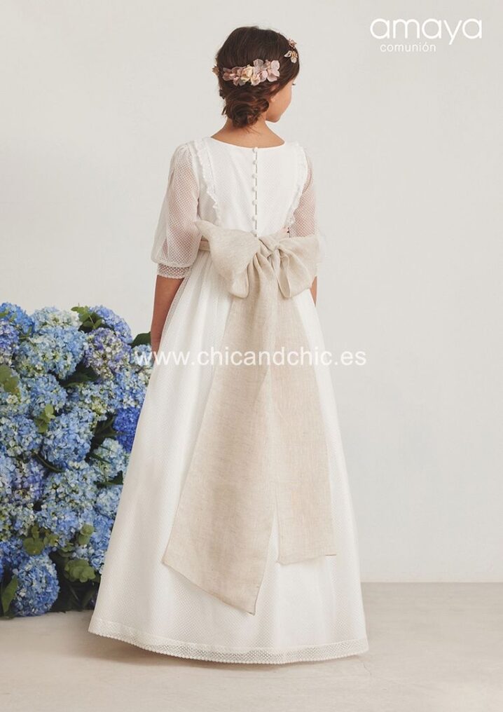 Vestido de comunión en tul bordado rombos blanco roto. Lleva manga al codo, rematada por una puntilla, al igual que la falda. Lleva un fajín en lino tostado con una bonita lazada trasera.