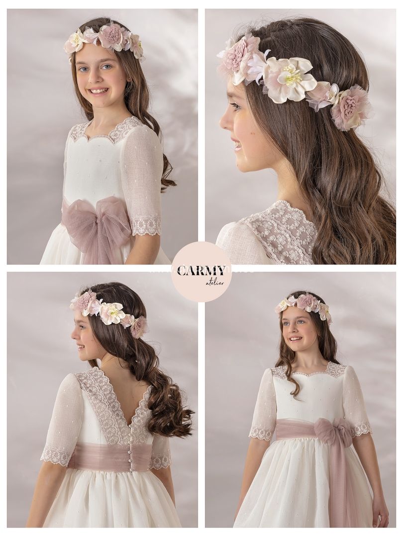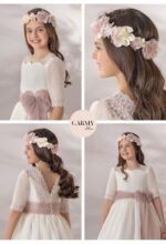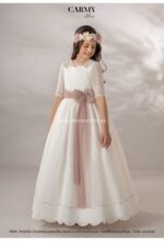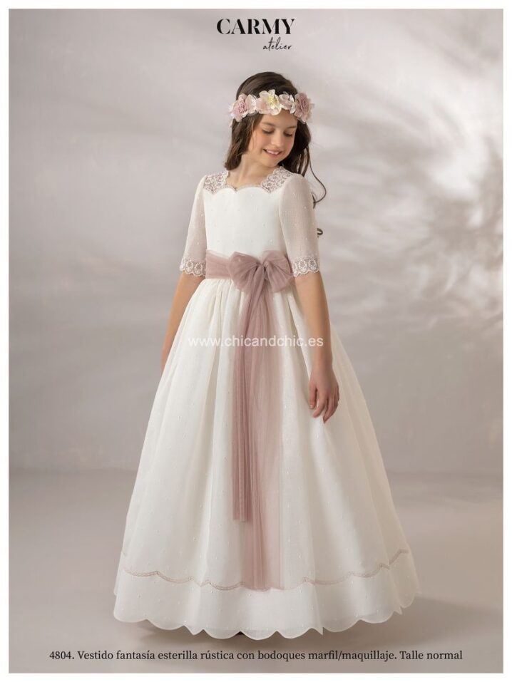 Vestido de comunión en tejido rústico de topos. De manga francesa, todo el vestido es de topos con unas preciosas puntillas en las mangas y el escote. La falda termina en ondas, con un remate a juego con el fajín rosa maquillaje.