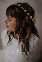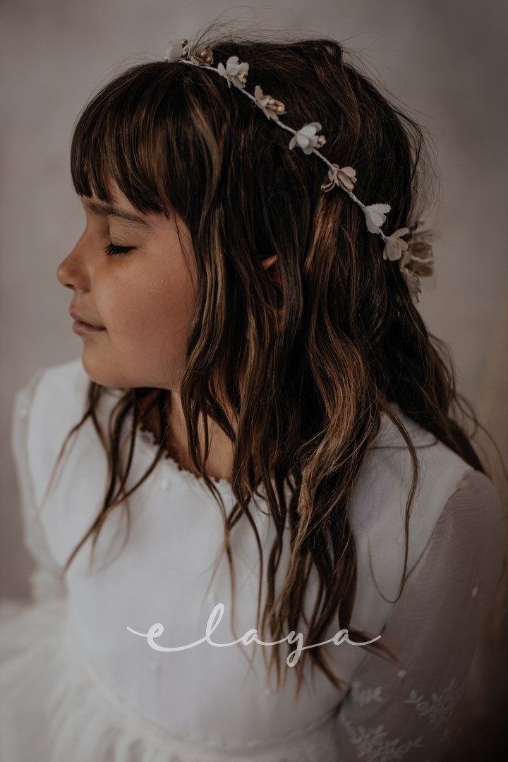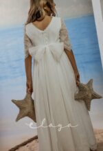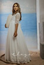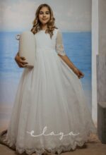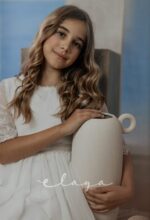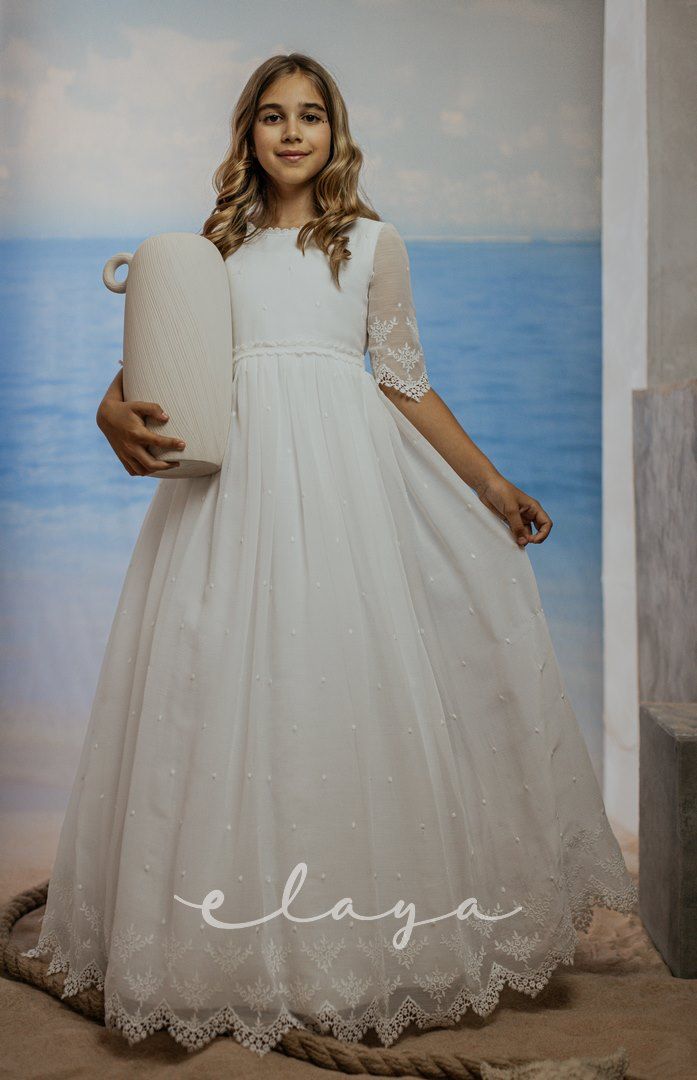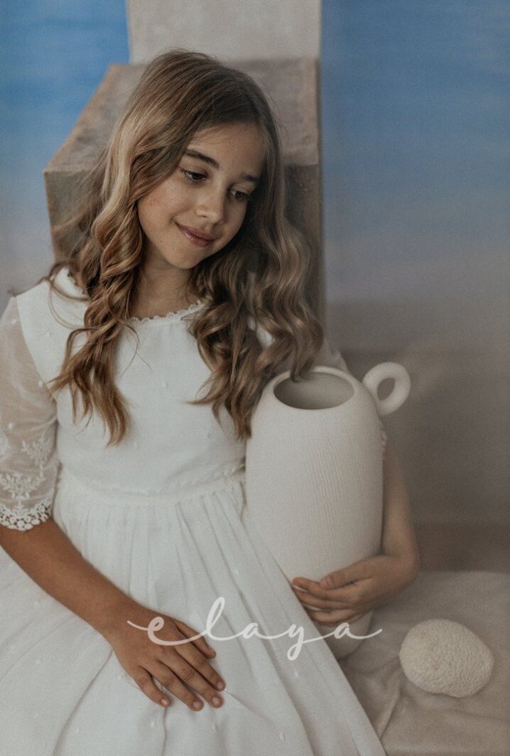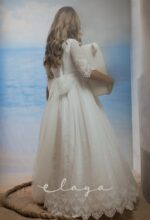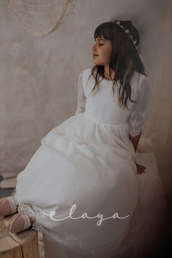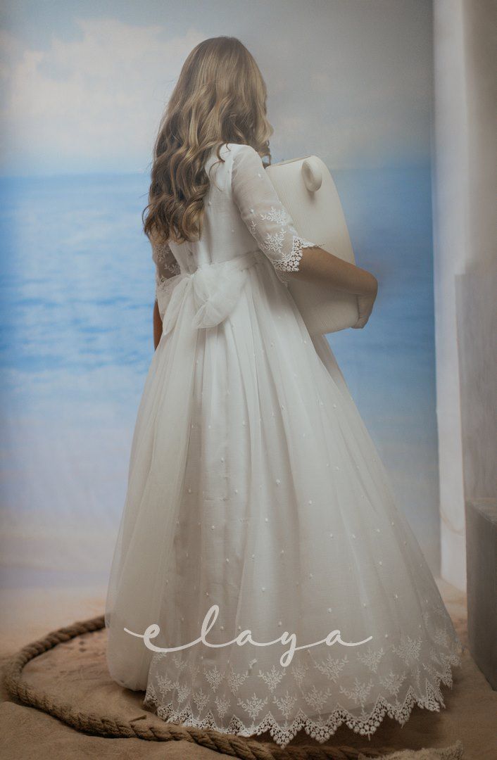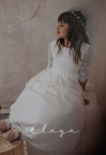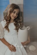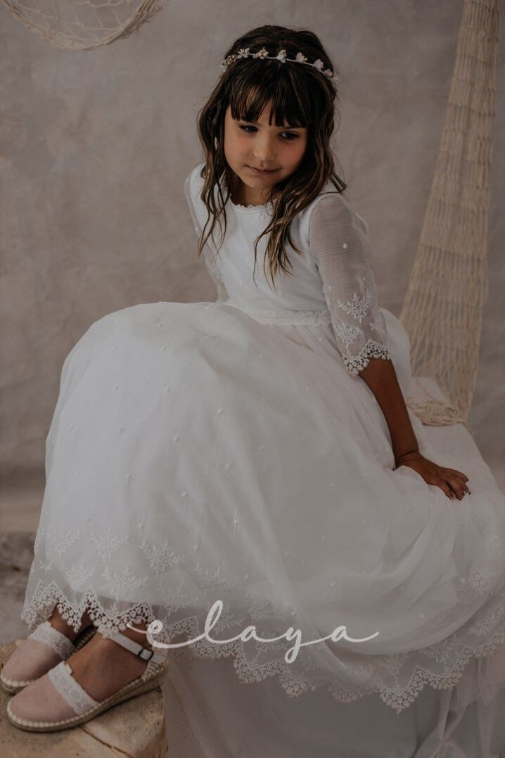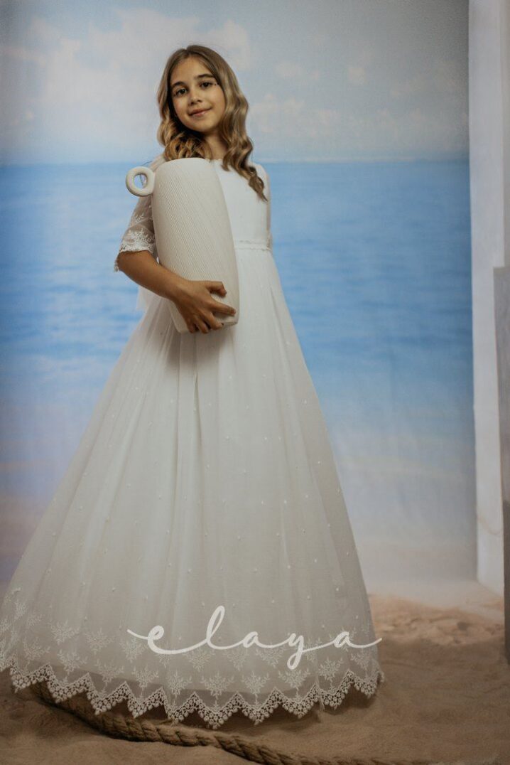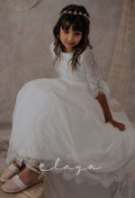 Vestido de comunión en bambula bordada. Es de manga francesa con un precioso dibujo bordado, al igual que en la falda del vestido. Lleva un fajín de puntillas en el mismo tono del vestido, acabado con una lazada en tul blanco roto.