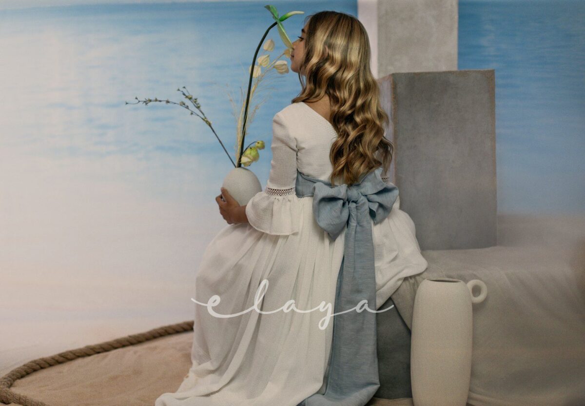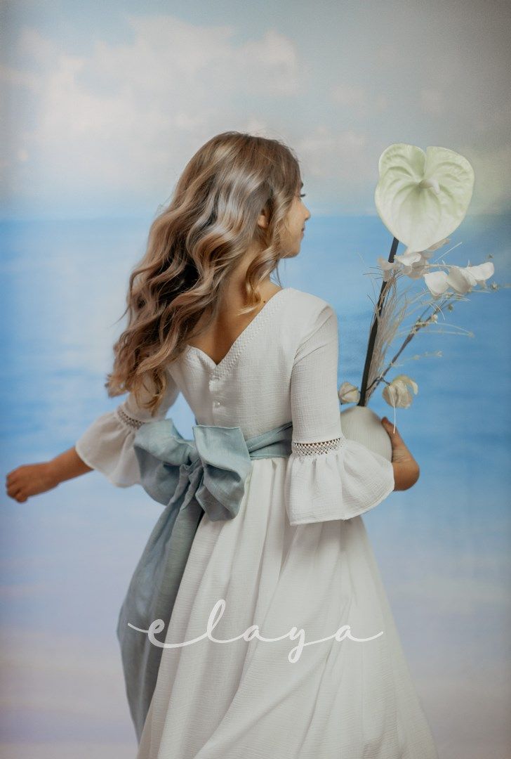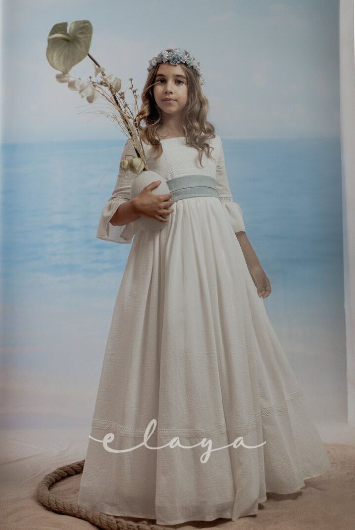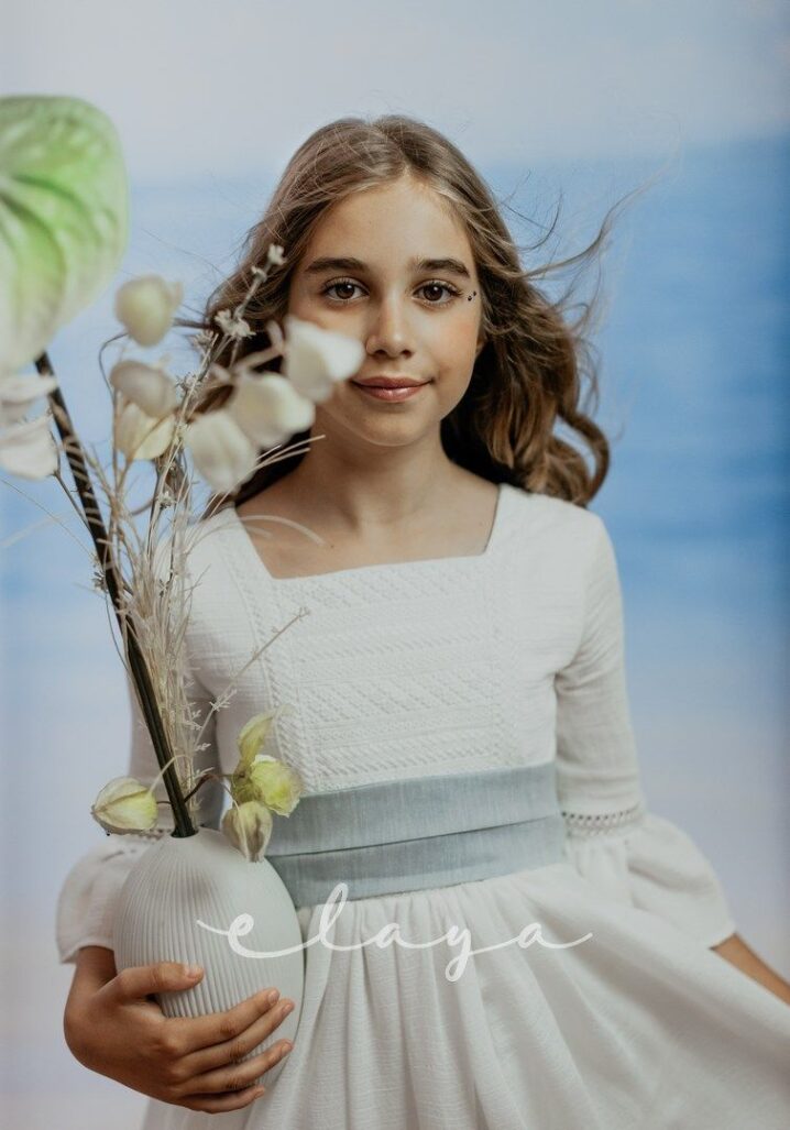 Vestido de comunión bambula ELISA. Blanco roto-azul