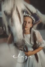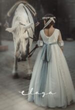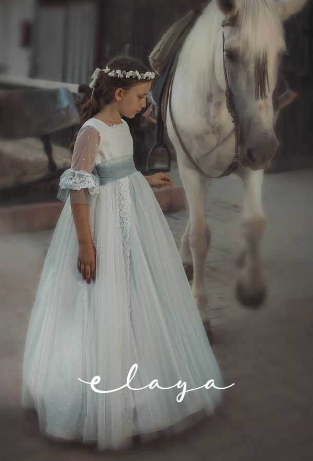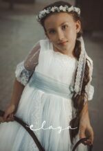 Vestido de comunión en tul bordado . Lleva una manga recta, con un volante de tul verde agua. La falda es de tul bordado en blanco roto, con la parte de abajo en verde agua , al igual que el fajín, que acaba con lazada trasera.