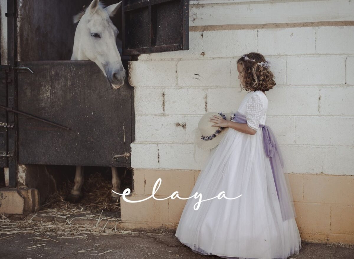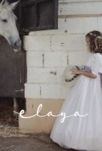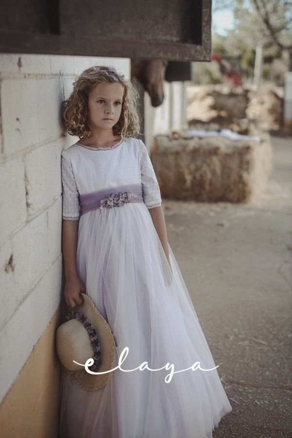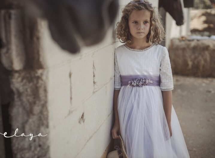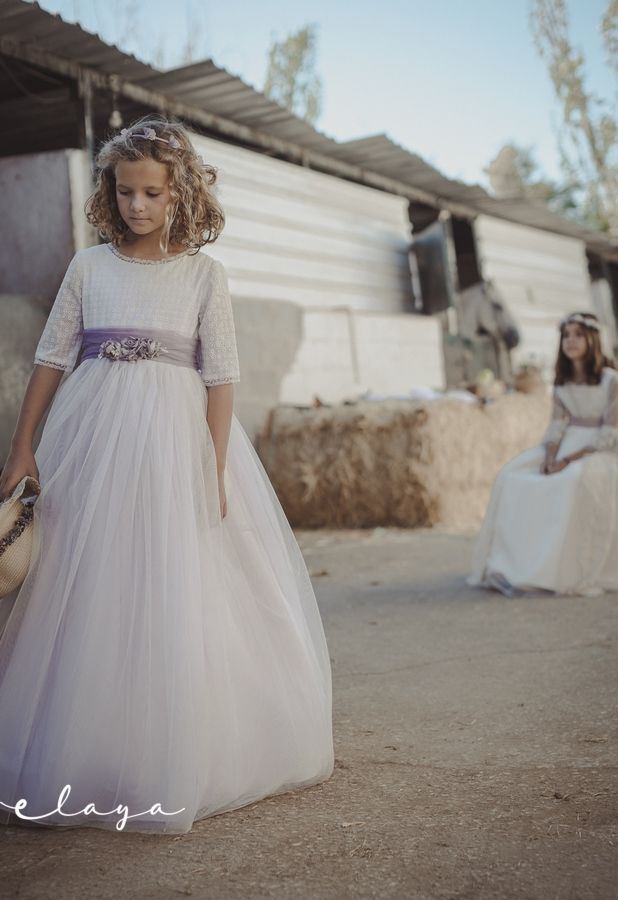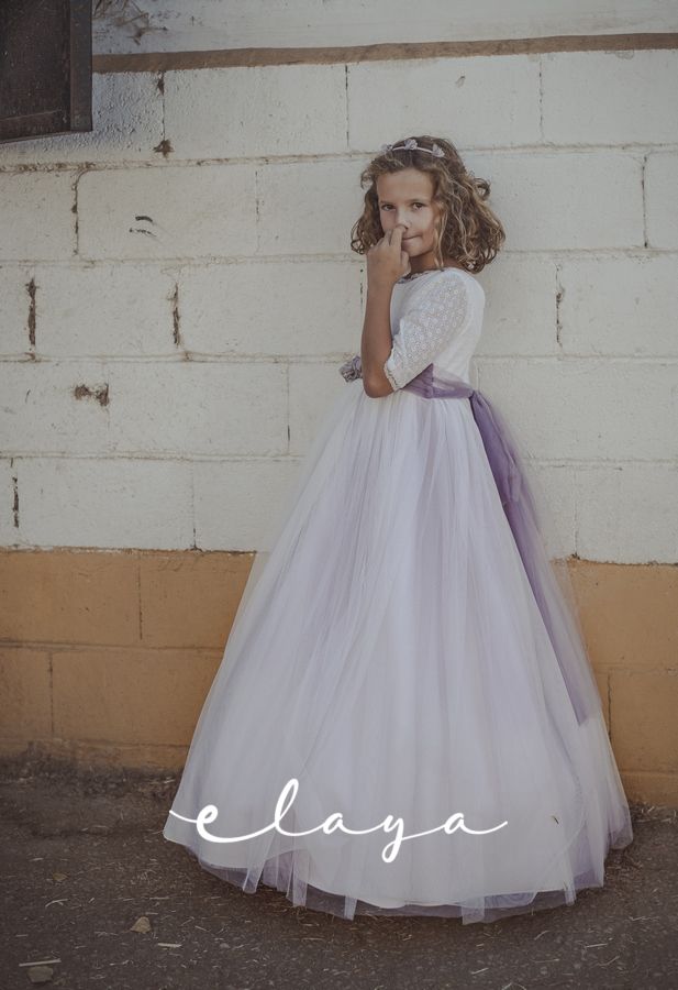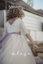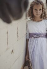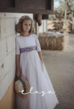 Precioso vestido de comunión en manga francesa. El cuerpo es voile bordado en color blanco roto, y la falda es de tul liso de color malva . Lleva un fajín de tul en el mismo tono malva, con lazada trasera. La parte de atrás es en escote a pico, con puntilla fina alrededor.