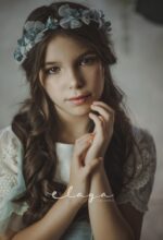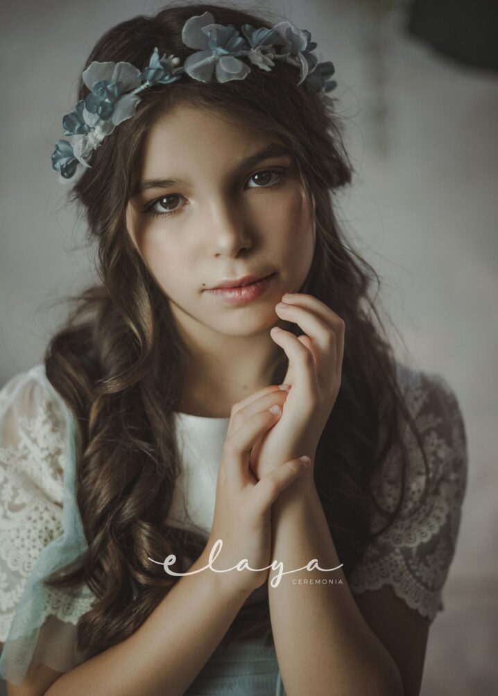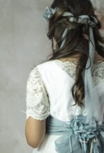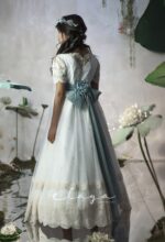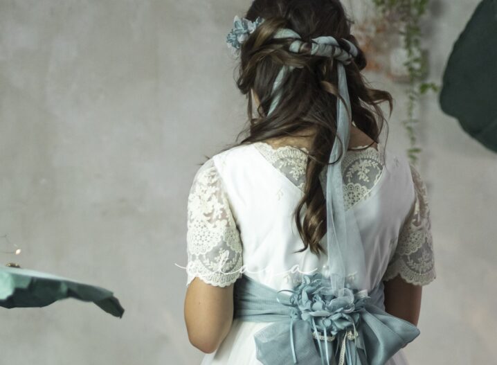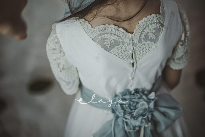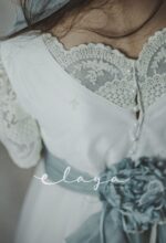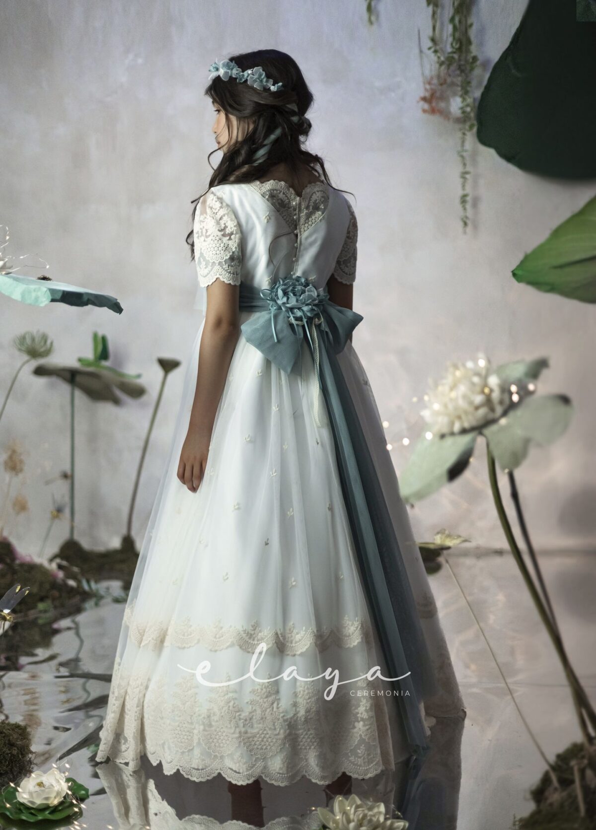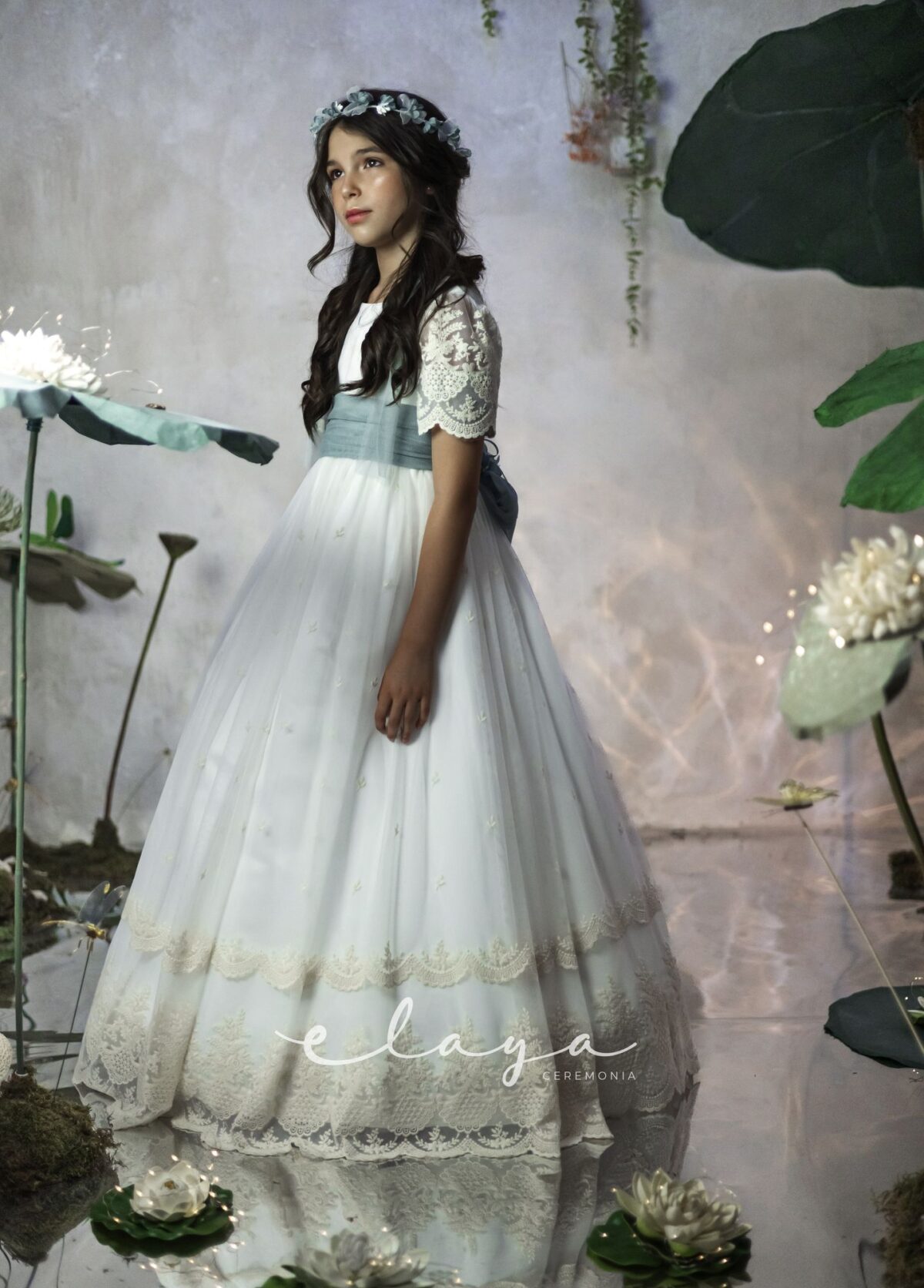 Vestido de comunión de manga corta en tul bordado . Lleva el cuerpo y la falda en tul bordado beige, con un fajín en tul verde agua.
