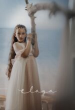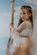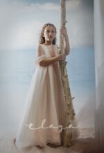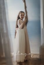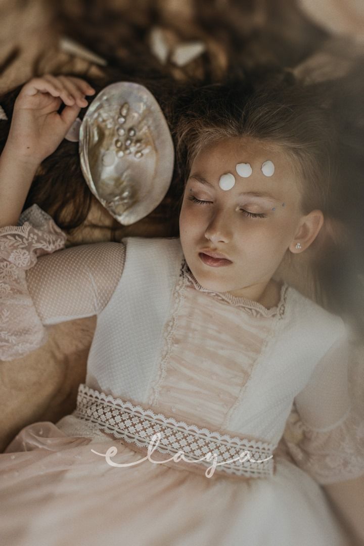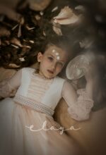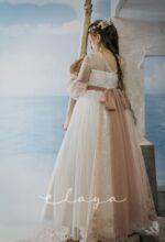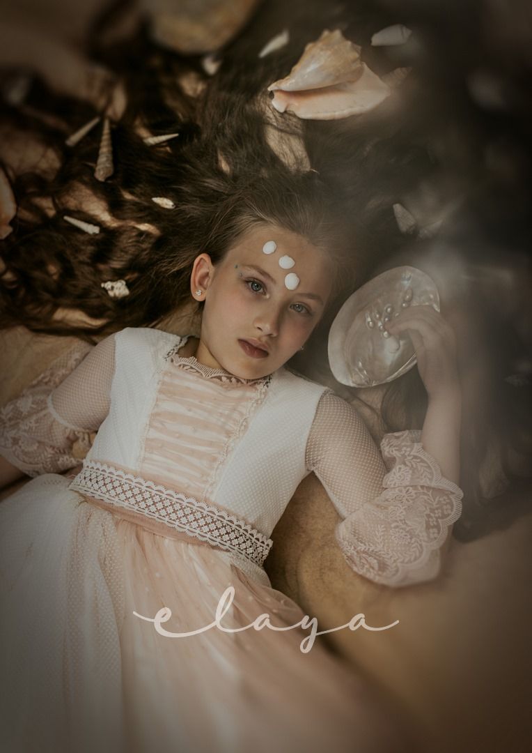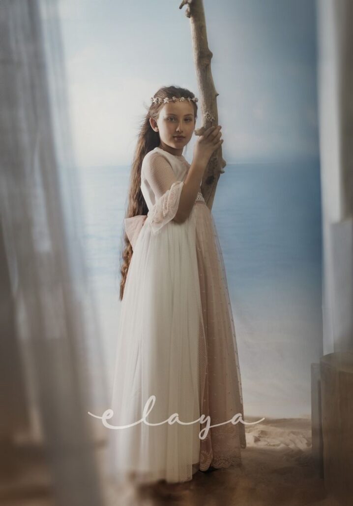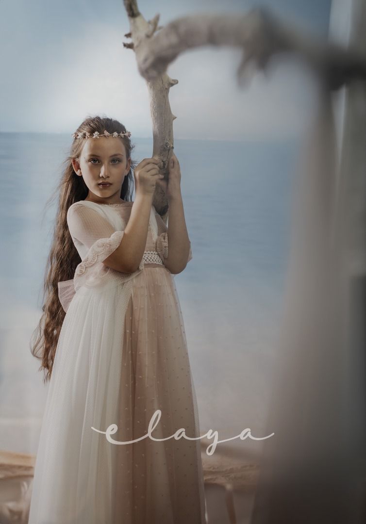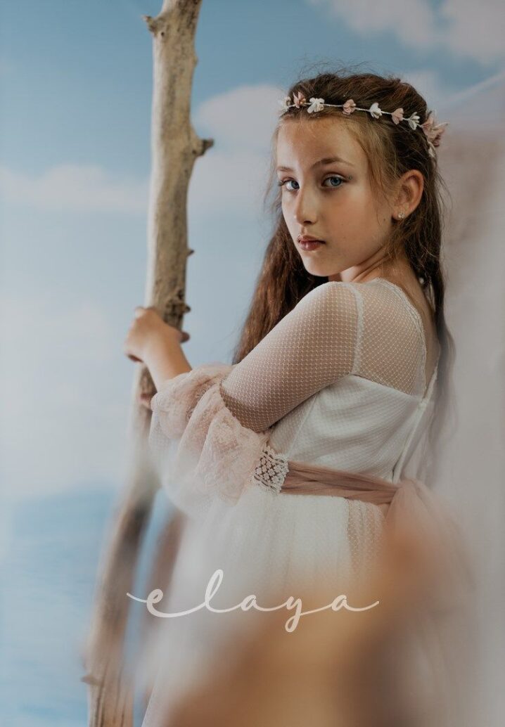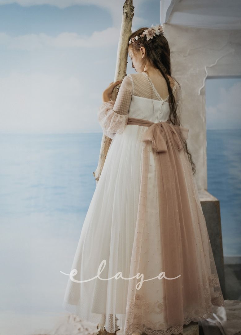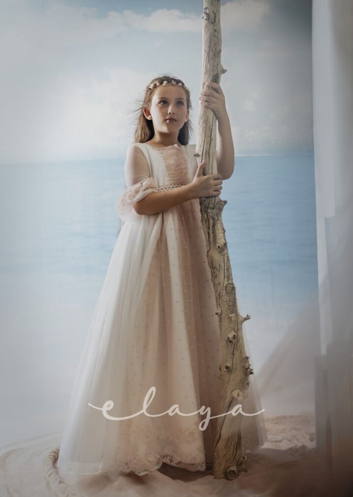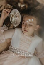 Espectacular vestido de comunión en tul rombitos y tul bordado en tono rosa maquillaje. Es de manga francesa, de tul bordado en rosa maquillaje. La espalda tiene una parte en tul que se trasparenta. Lleva un fajín de tul en el mismo tono de la falda del vestido.