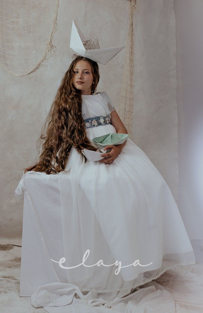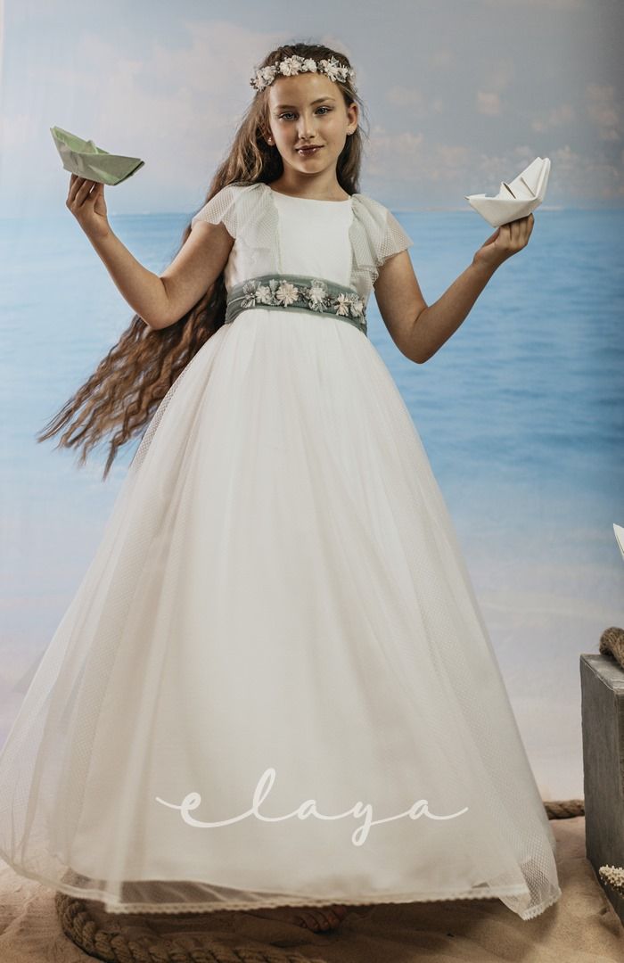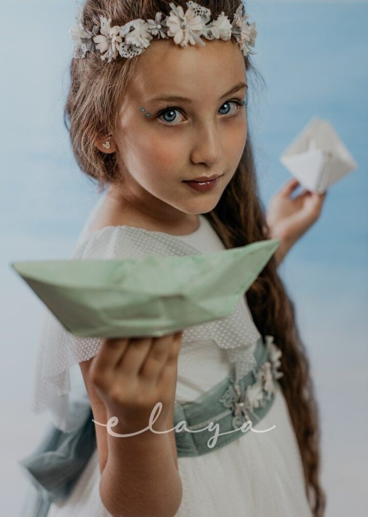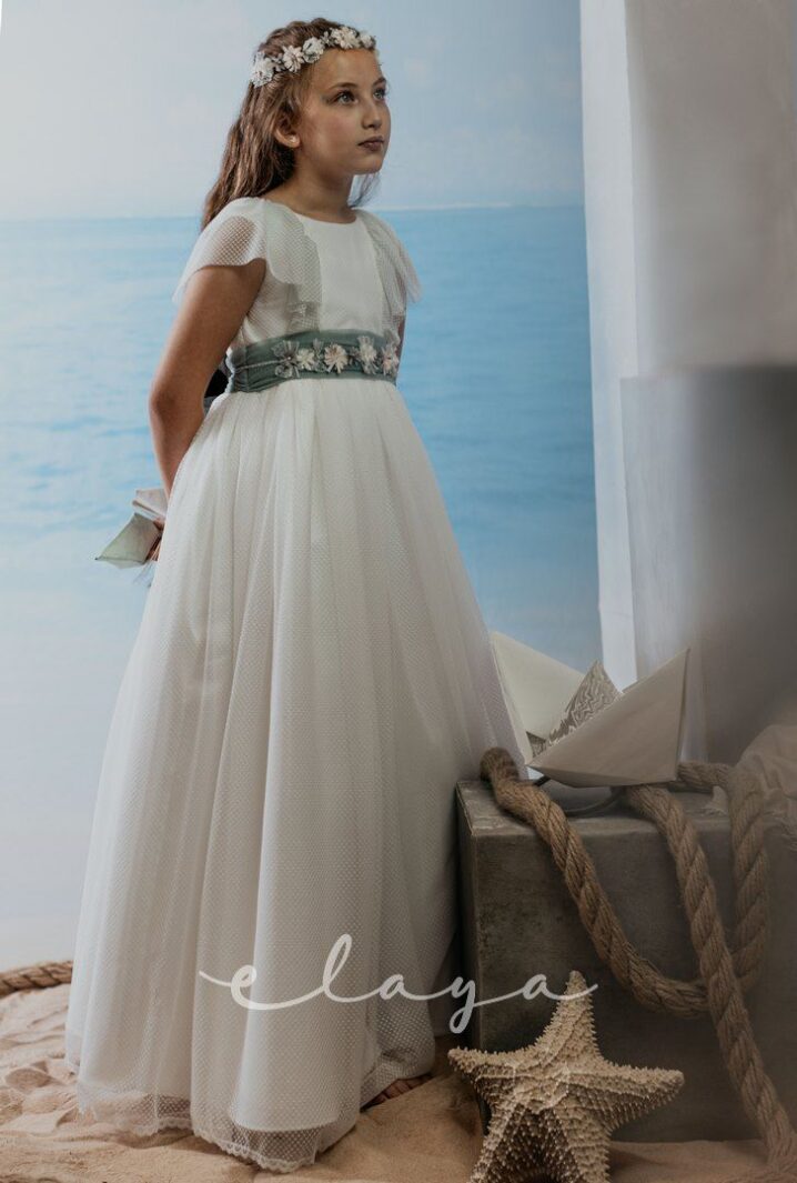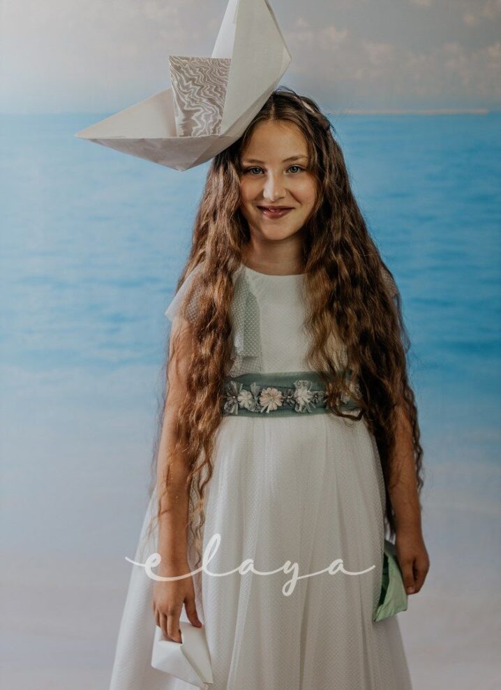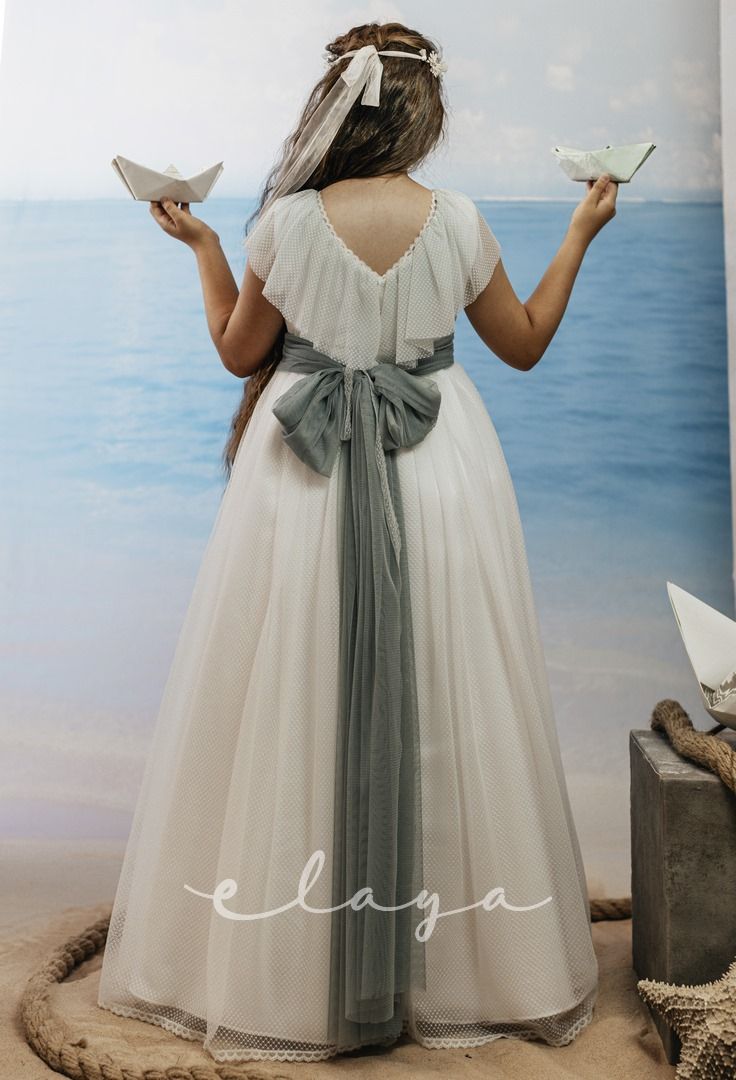 Vestido de comunión tul dibujo redecilla blanco roto . Lleva unas originales y bonitas mangas, con un escote acabado en volante en tono verde agua, al igual que la con lazada trasera.