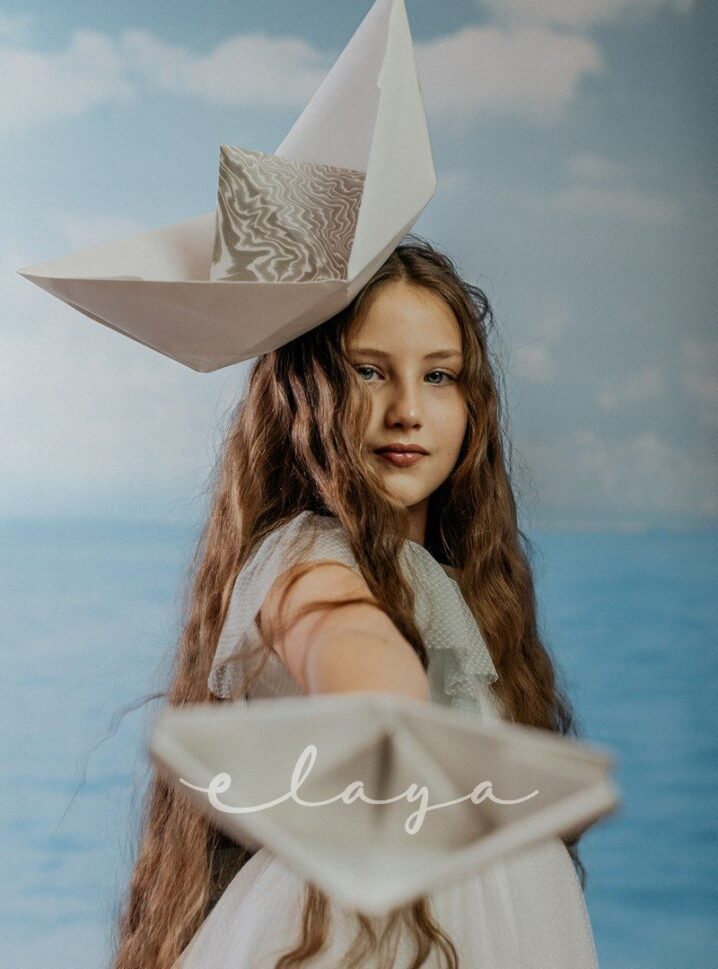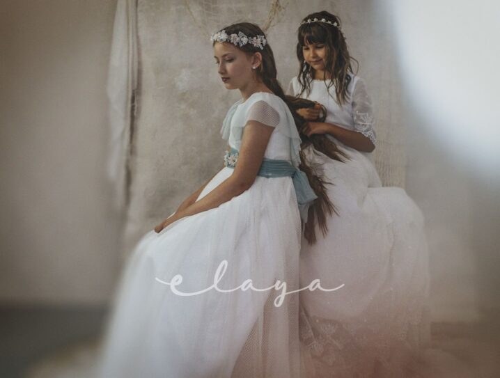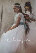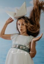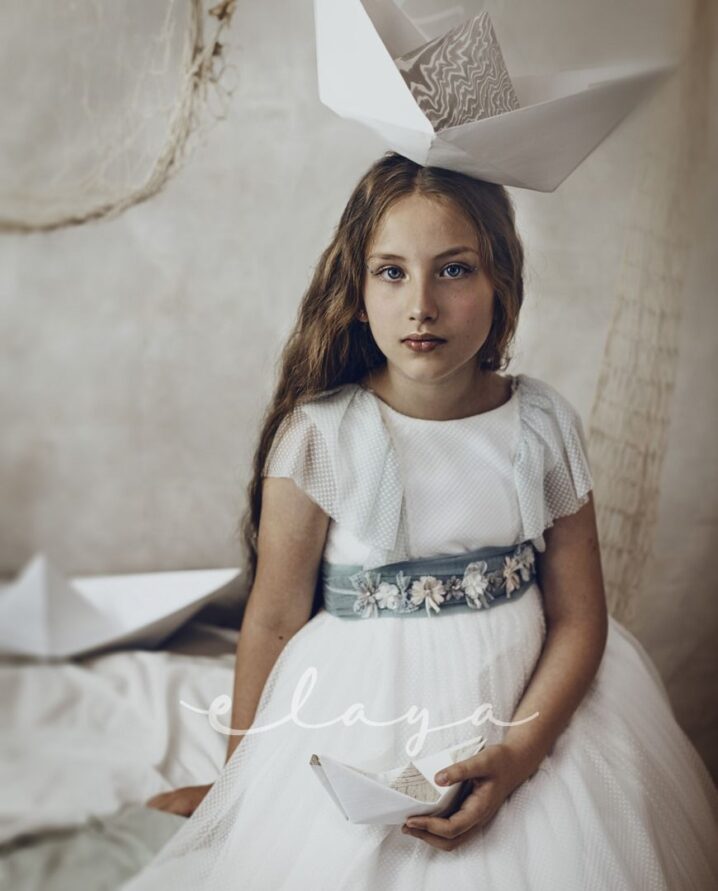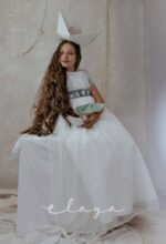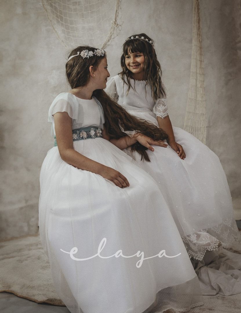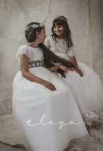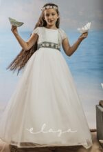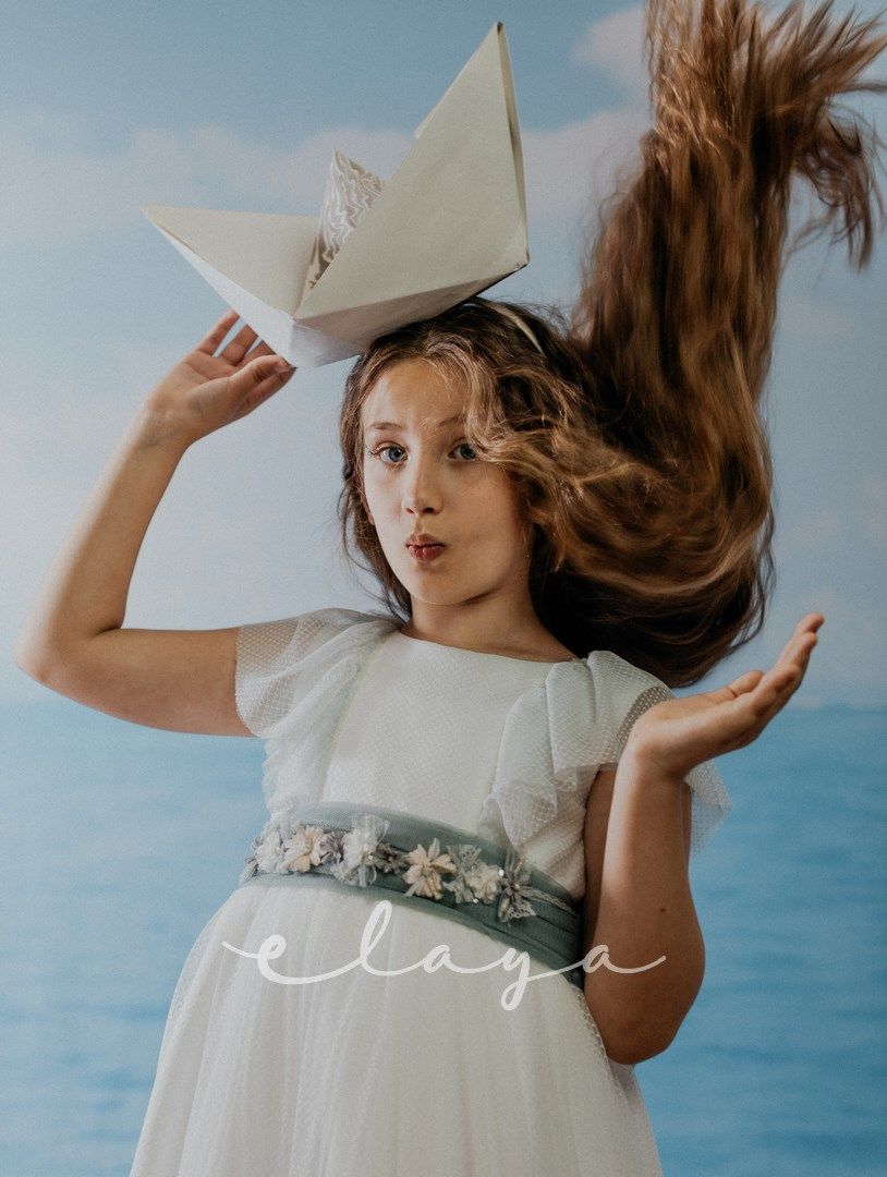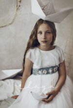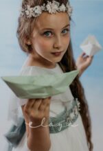 Vestido de comunión tul dibujo redecilla blanco roto . Lleva unas originales y bonitas mangas, con un escote acabado en volante en tono verde agua, al igual que la con lazada trasera.