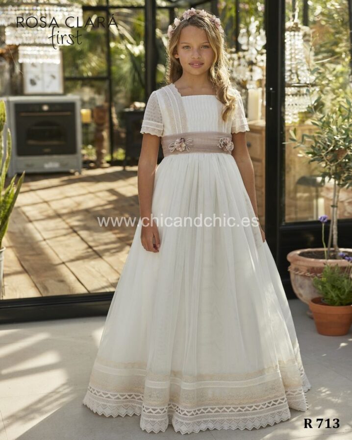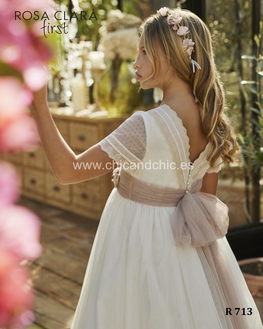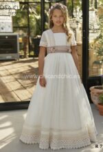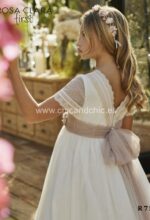 Vestido de comunión de tul en manga corta. En el cuerpo y la falda, va decorado por unas espectaculares puntillas. La espalda es a pico y el fajín es de tul en rosa maquillaje, con lazada ya hecha.