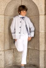Almirante de una fila cuello mao tipo. Casaca en gris claro, al igual que el chaleco, y pantalón en crudo.Corbata en marino de dibujos, a juego con los ribetes.