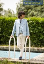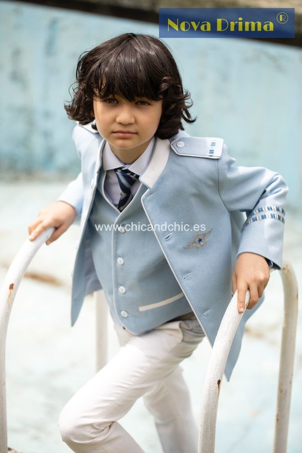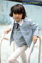 Almirante de una fila cuello mao tipo. El pantalón blanco roto y casaca y chaleco celeste.